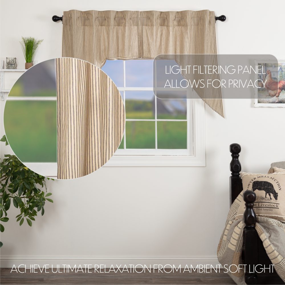 The Sawyer Mill Charcoal Ticking Stripe Swag Set adds charming farmhouse style to your home. Swag curtains are a classic country style featuring angled drapes to frame your window while leaving space open for additional natural light. Our curtains feature a deep tan base and charcoal black striping for a vintage farmhouse feel. Includes a rod pocket for easy hanging. Designed to coordinate with the Sawyer Mill collection for a complete look.