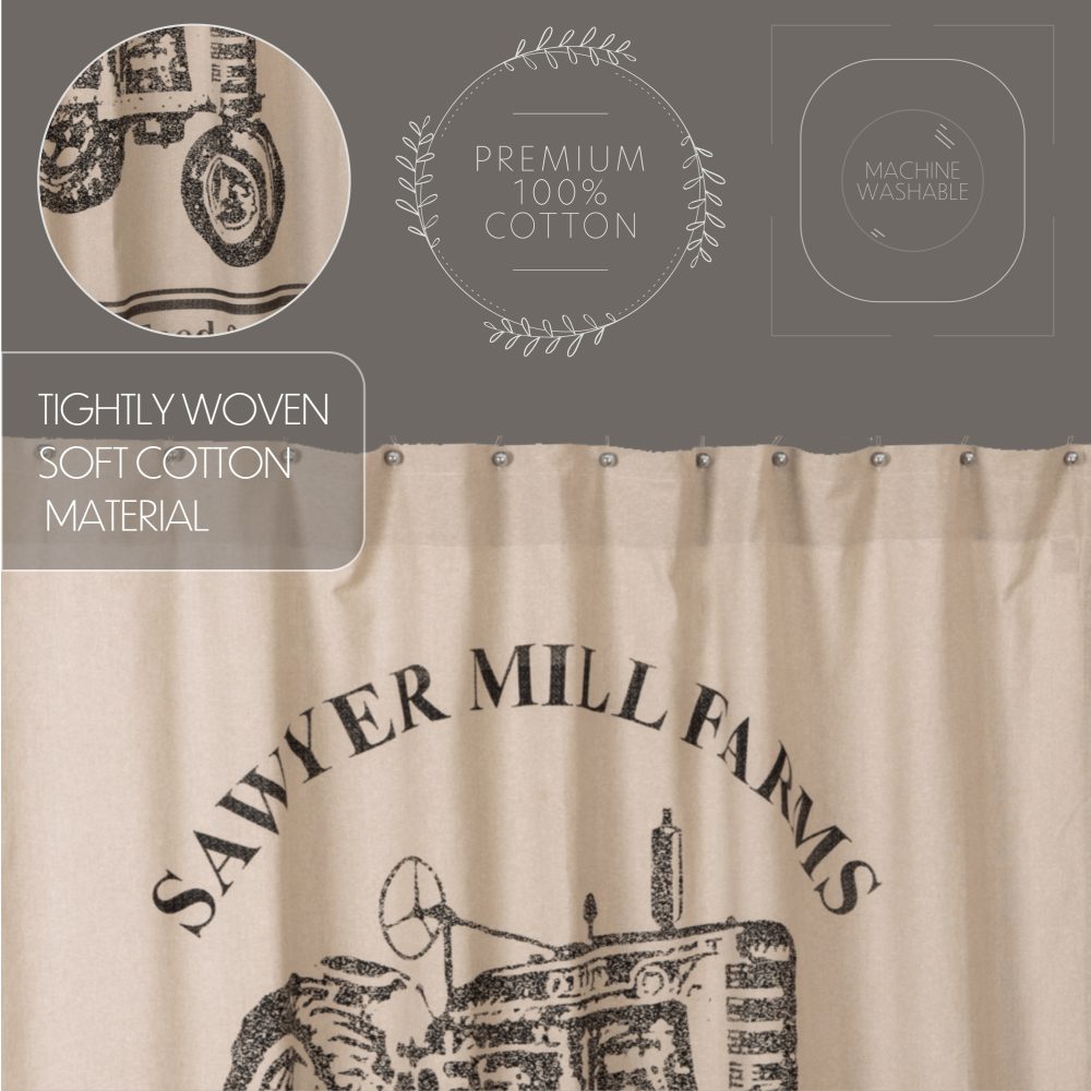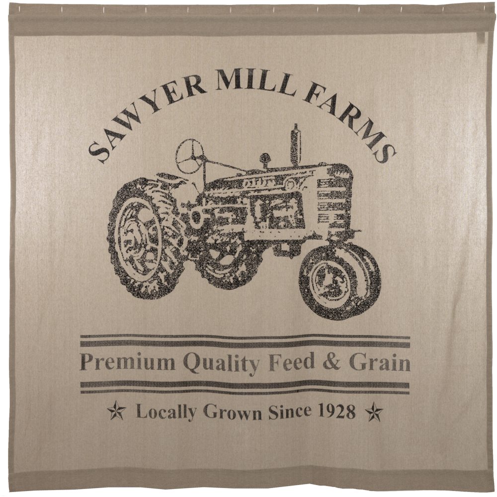 Depicting a weathered tractor in a vintage fashion with the words "Sawyer Mill Farms" above it, the Sawyer Mill Charcoal Tractor Shower Curtain lends country appeal to your bath. The phrases "Premium Quality Feed & Grain" and "Locally Grown Since 1928" calls to mind the hardworking American farmland. The charcoal and tan colors add warm, soothing colors to your home. Measures 72 by 72 inches to fit standard sized showers and baths. Easily hang this classic country bath curtain with shower hooks of your choosing (not included) using the button holes attached. A 3" rod pocket is also available as an alternative hanging method.