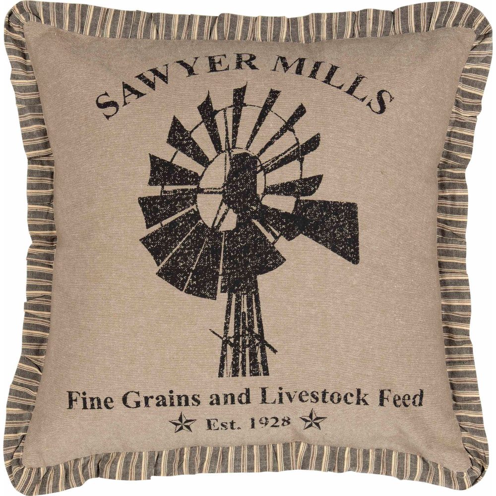 Craft a warm, welcoming and vintage farmhouse with simple, uncluttered designs from the Sawyer Mill Collection. The Sawyer Mill Charcoal Windmill Pillow measures 18 by 18 inches and features a khaki and charcoal black color scheme. The front features a distressed black stenciling of a windmill with grain sack labelling reading, "Sawyer Mills" and "Fine Grains and Livestock Feed". The comfortable, 100 percent cotton accent pillow reverses to the same khaki fabric with tie-style closures for easy cleaning. A striped ruffled trim softens the look. Machine washable and iron safe. Designed to coordinate with the Sawyer Mill Charcoal Collection from VHC for a complete rustic look with vintage farmhouse style.