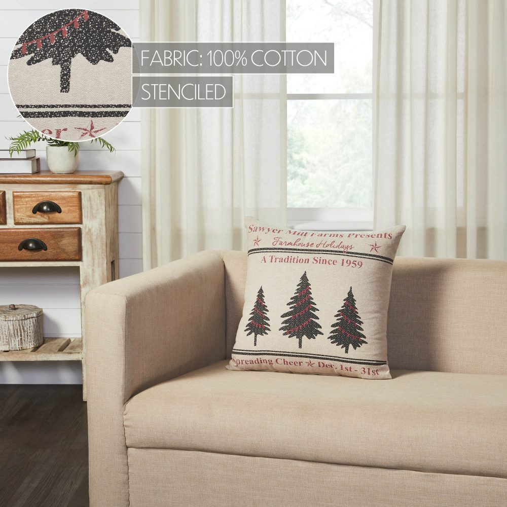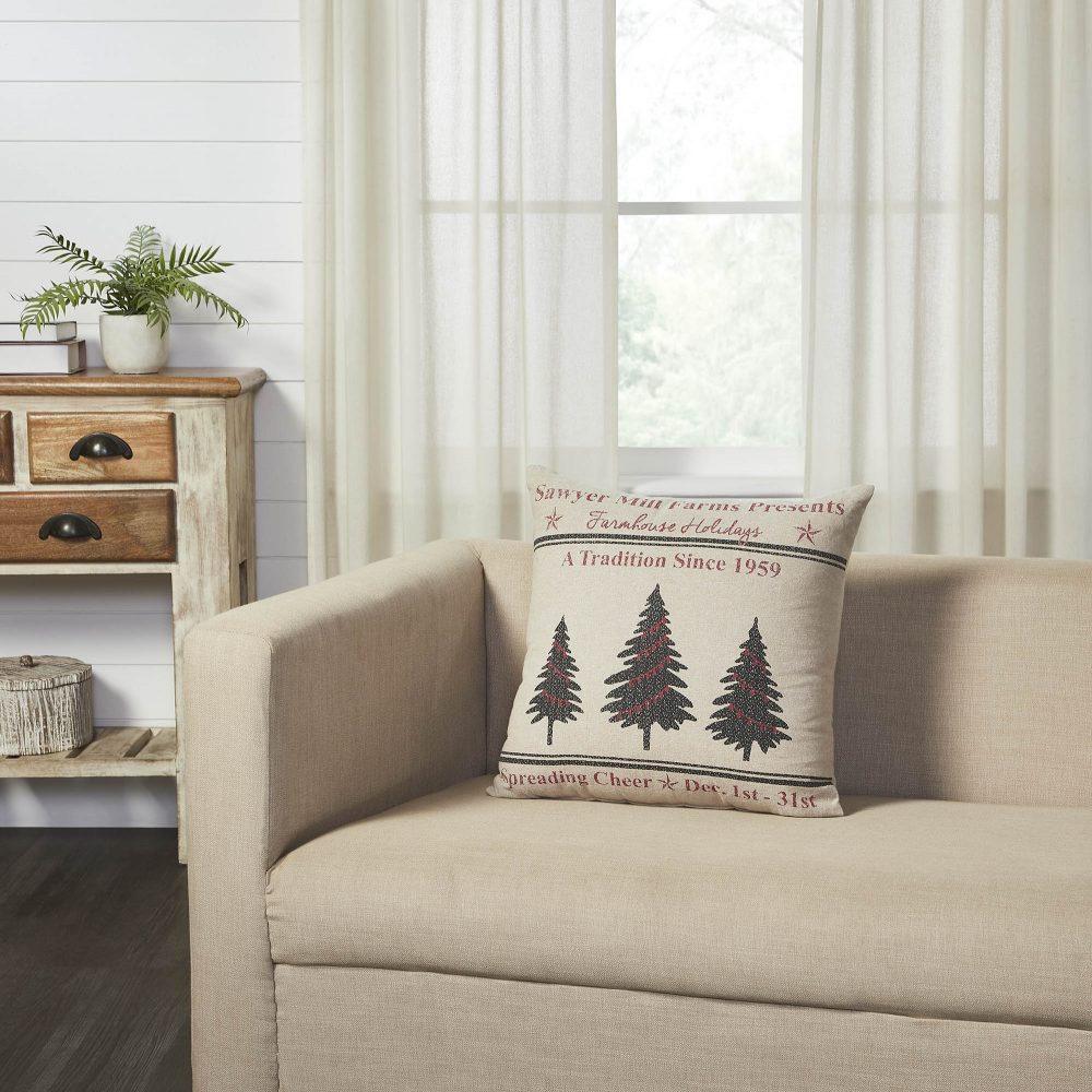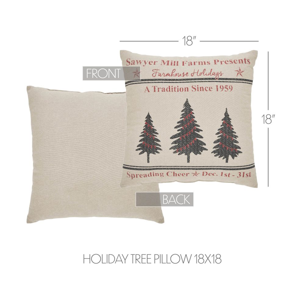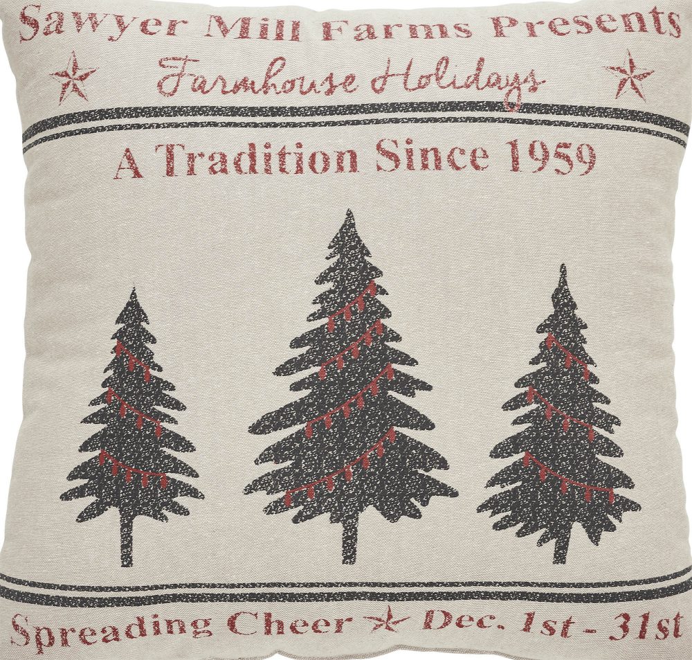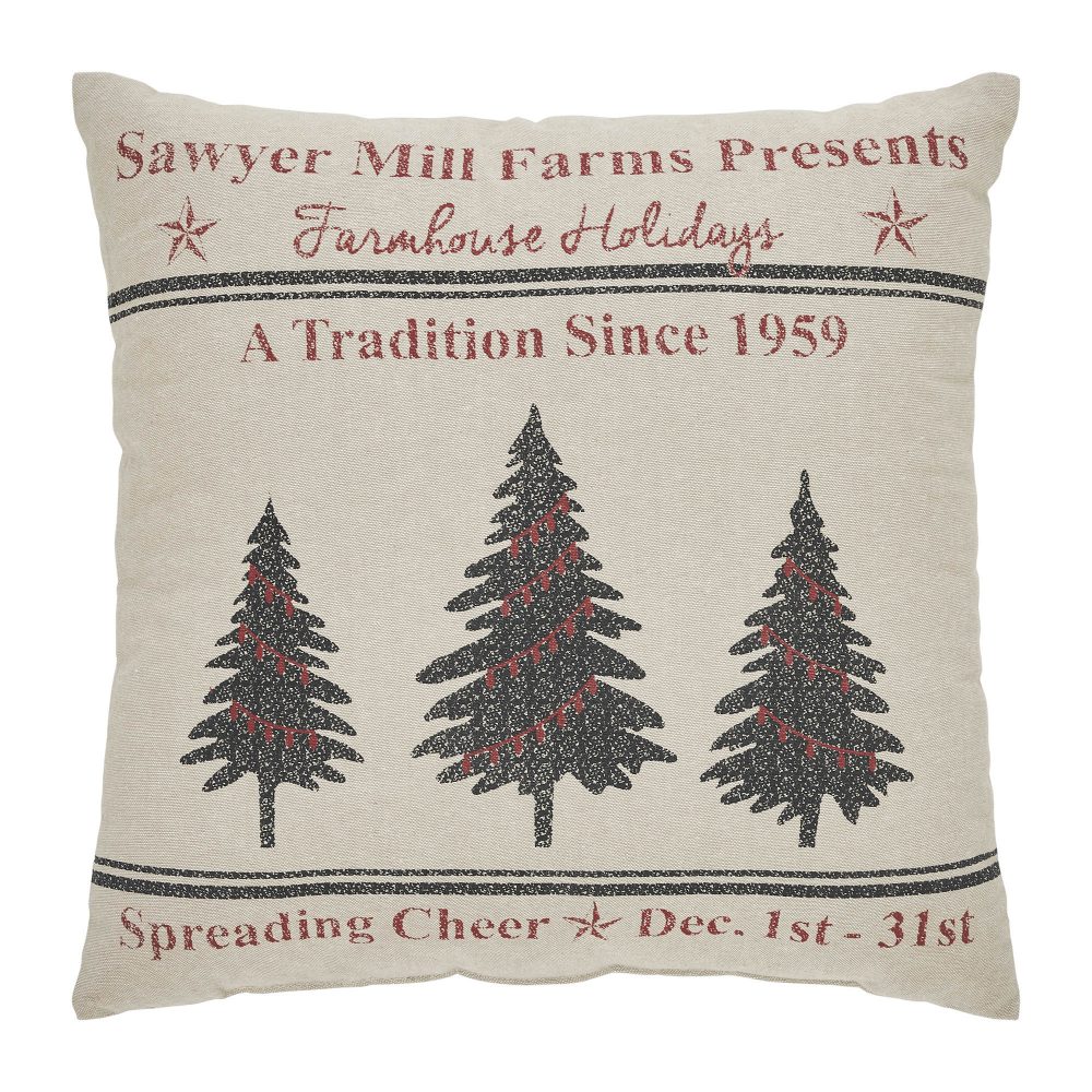 Create a warm, vintage inspired look for your holiday decor with this farmhouse Christmas accent pillow. The Sawyer Mill Holidays Tree Pillow measures 18 by 18 inches. The filled pillow features a charming distressed print on a deep tan base. The front of the pillow includes two grain sack style stripes framing a charming trio of Christmas trees with deep red Christmas light accents. Word art surrounding the design creates the look of a charming vintage farm advertisement. Spot clean as needed. Coordinates with the Sawyer Mill Collection by VHC for vintage farmhouse style for your whole home.