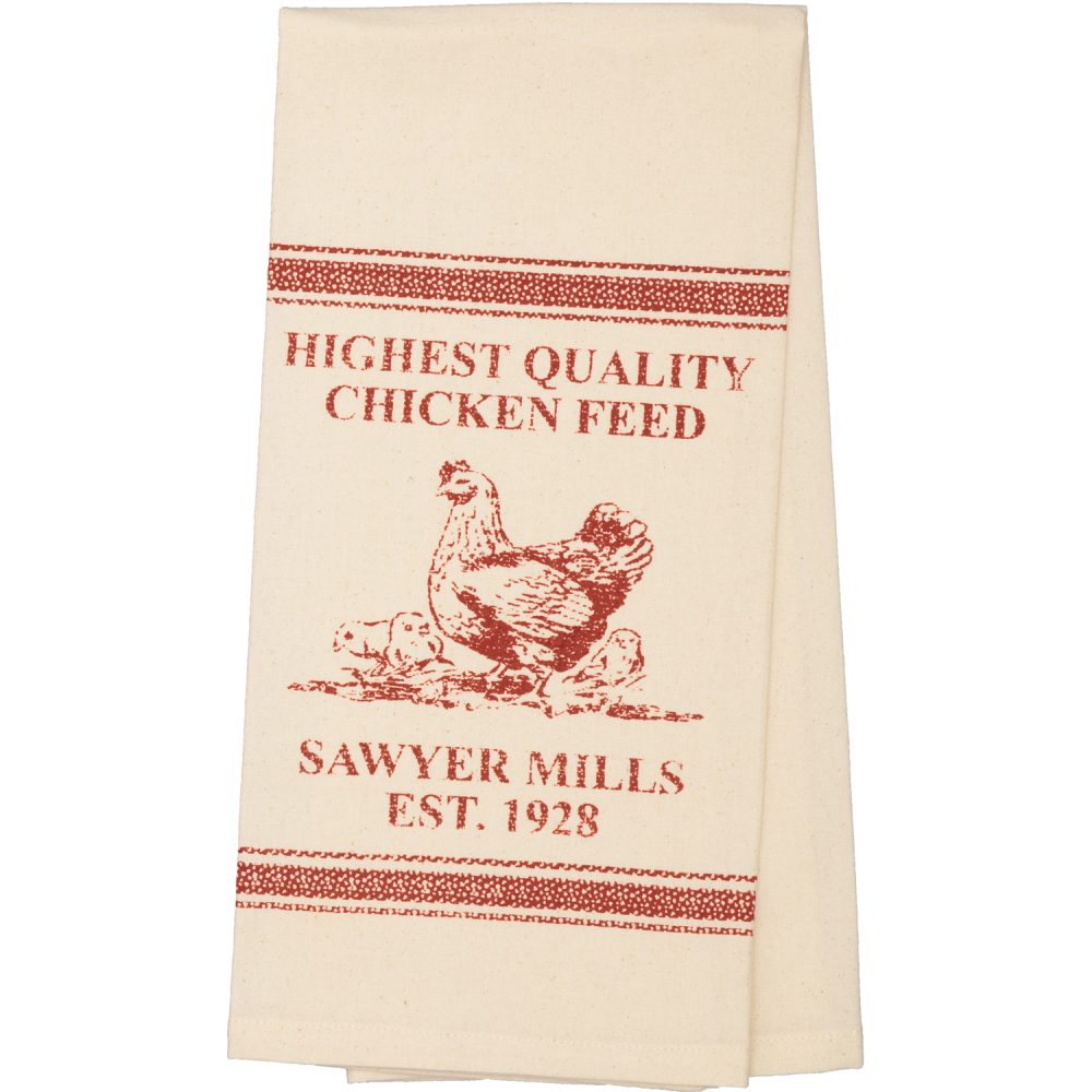 Add a little personality to your country farmhouse kitchen with this printed tea towel. The Sawyer Mill Red Chicken Muslin Unbleached Natural Tea Towel measures 19x28 inches. The kitchen towel features a distressed hen and chicks design with farm details and weathered, horizontal stripes in country red on unbleached, natural cotton Muslin. The design features a helpful loop for easy hanging. Coordinates with the Sawyer Mill Collection by VHC for vintage farmhouse style in your kitchen and throughout your home.