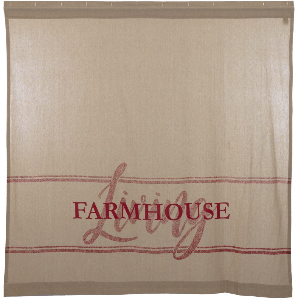 Express your enjoyment of "Farmhouse Living" with the Sawyer Mill Red Farmhouse Living Shower Curtain. Red distressed lettering on a tan chambray background is framed by stripes reminiscent to those found on rustic grain sacks. The word "Living" styled in vintage-style cursive adds a touch of elegance to this simple 72x72 shower curtain. A rod pocket and button-hooks offer options when hanging this curtain in your bath area.