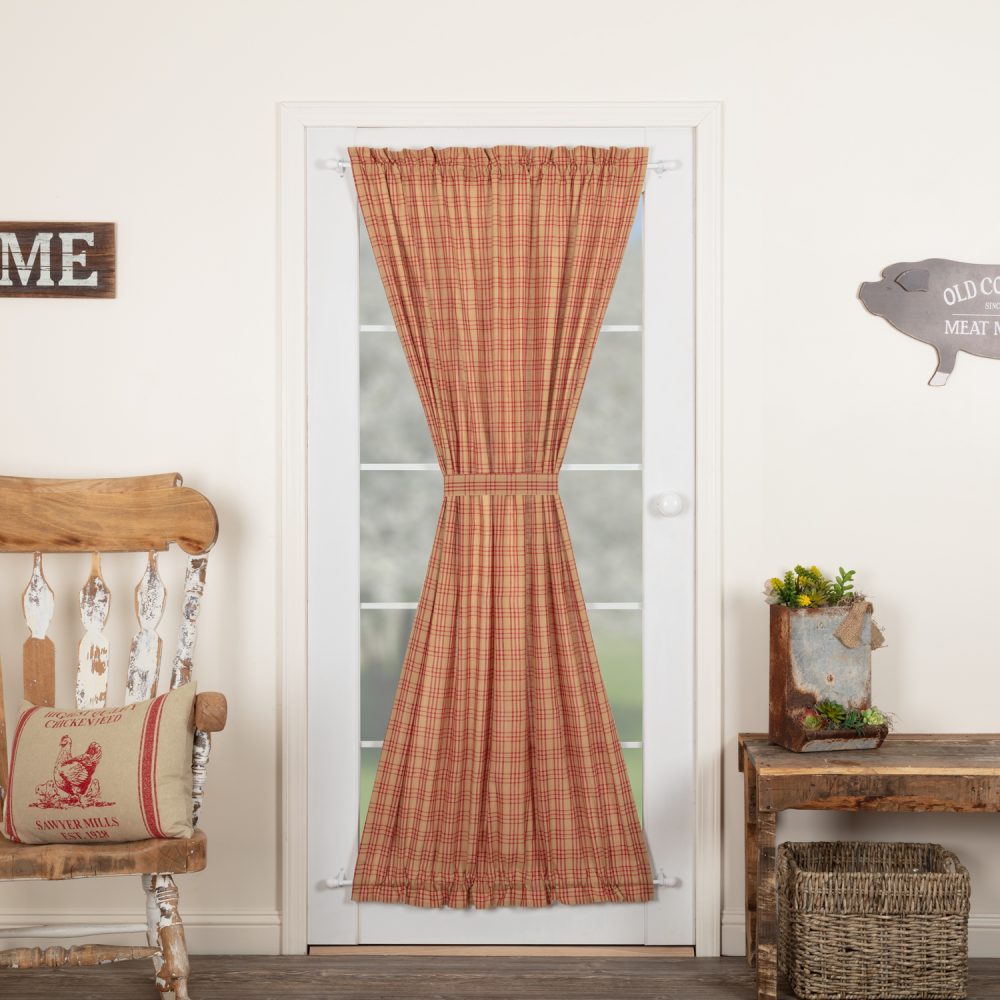 Create a modern farmhouse look for your home. The Sawyer Mill Red Plaid Door Panel 72x40 features country red and dark tan in a classic plaid pattern on a quality 100% cotton material. Lined with soft, white fabric, the panel provides privacy while adding style. Includes 1 matching tieback with a button to wrap around the center for a different look and two rod pockets for easy hanging.