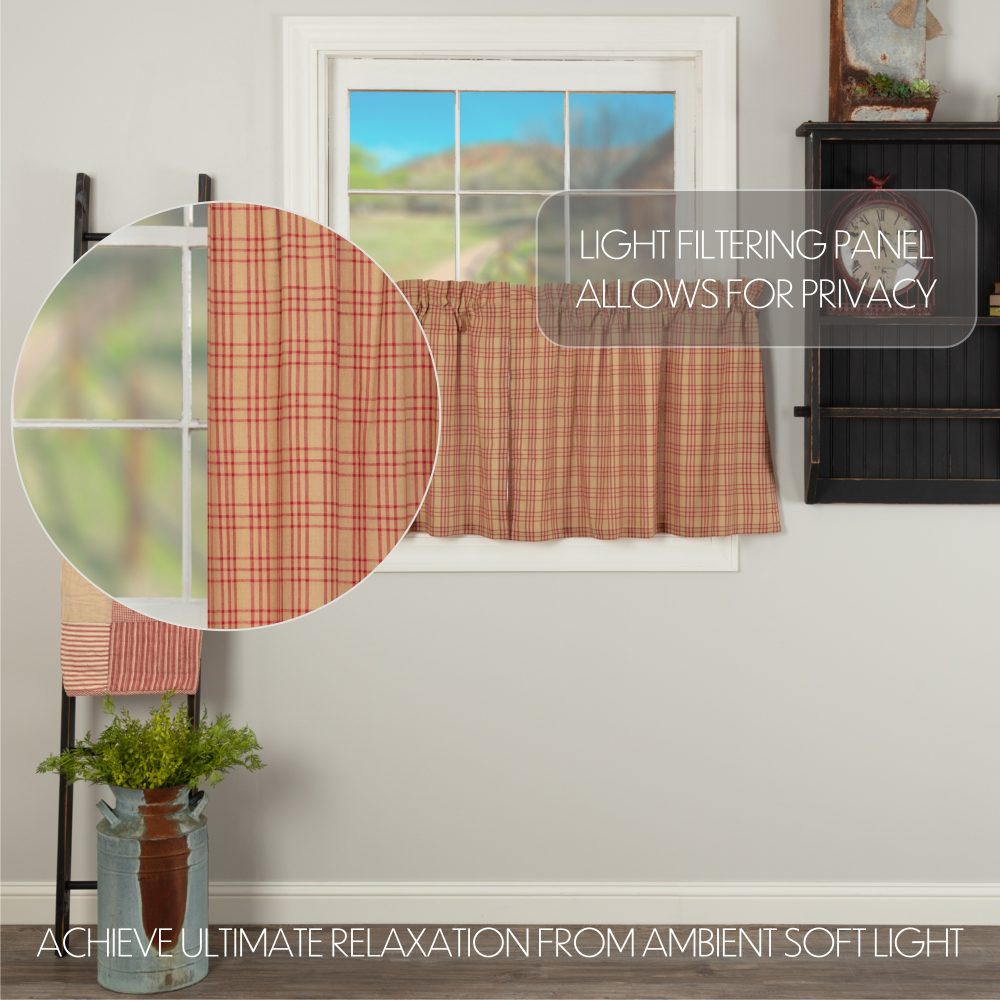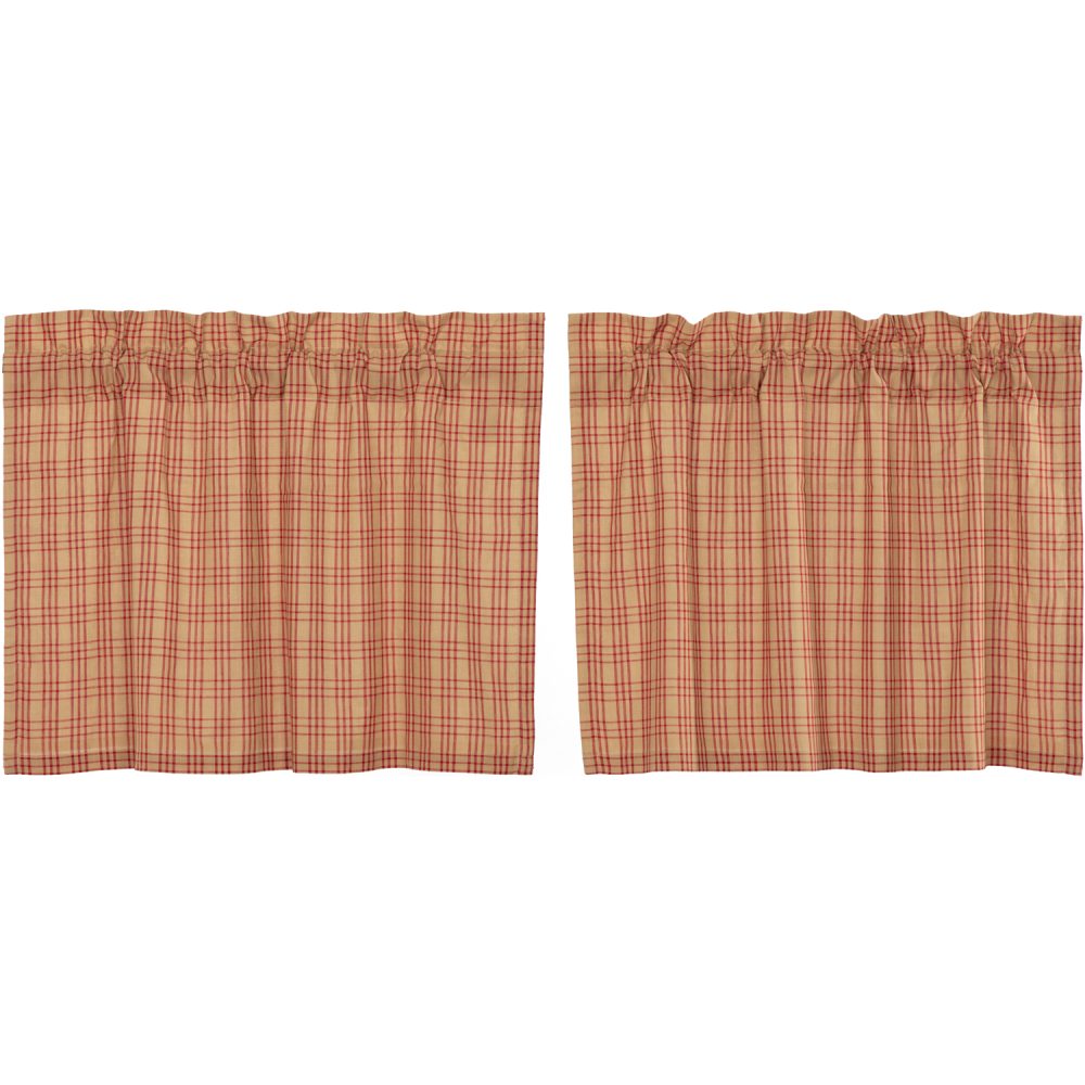 Create the perfectly charming country window of your dreams with these 24x36 inch tier-style curtains. Featuring country red and dark tan plaid, the Sawyer Mill Red Plaid Tier Set provides just the right balance of privacy and sunshine. Pair with a matching valance or prairie swag for a fully decorated look or alone for a simple pop of color and character. Also known as cafe or bistro curtains, these are a particularly good fit for decorating farmhouse kitchens, laundry rooms, and small bathroom windows.