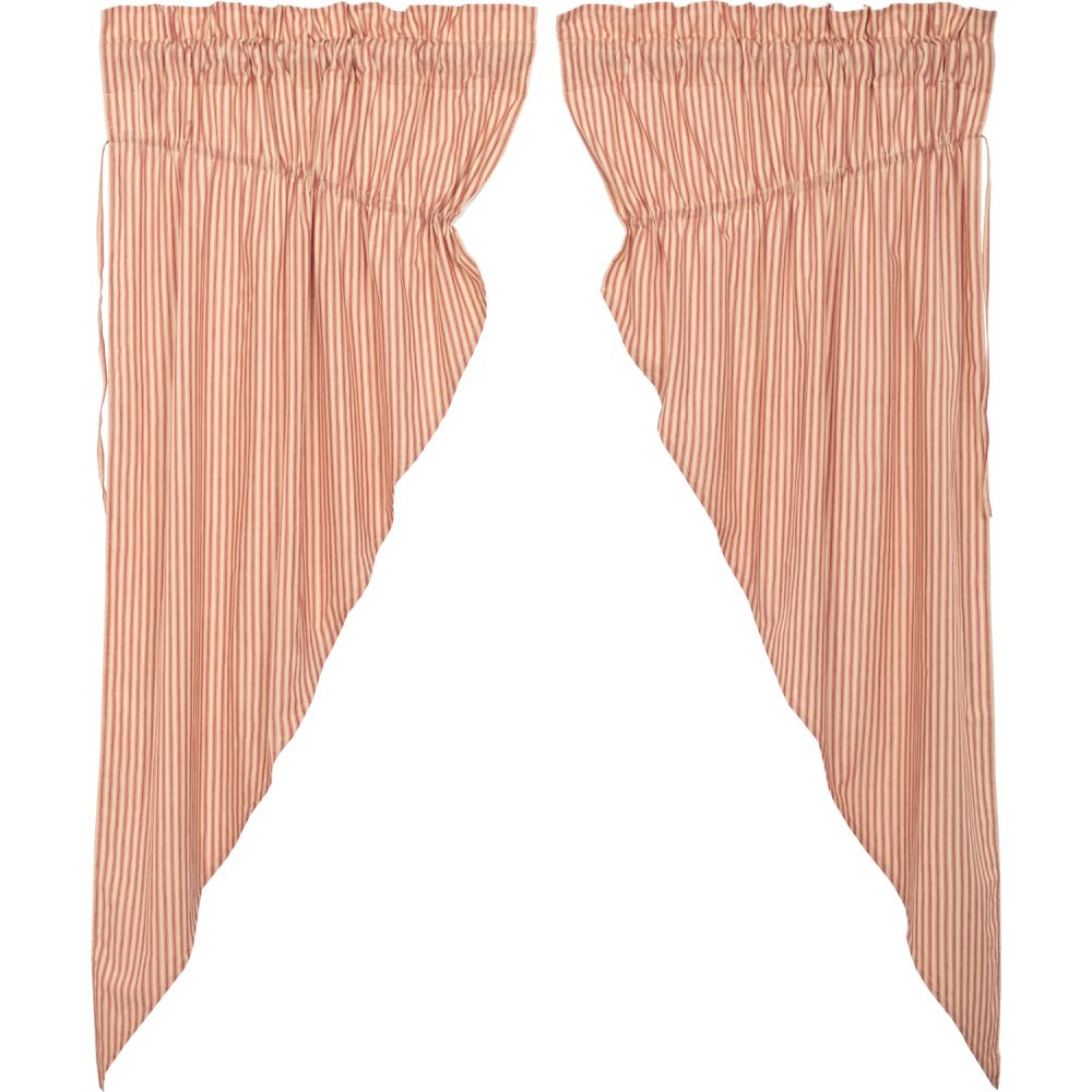 The Sawyer Mill Red Ticking Stripe Prairie Short Panel Set creates a relaxed country feel for your home. Featuring classic country red and dark tan ticking stripes, these curtains are a versatile choice for accenting vintage kitchens, farmhouse laundry rooms, and more. The gracefully angled drapes perfectly frame windows providing a bit of polish for your home. Our fully lined prairie panels come with built in drawstrings to adjust each panel to meet your style needs, along with a curtain rod pocket for easy hanging.