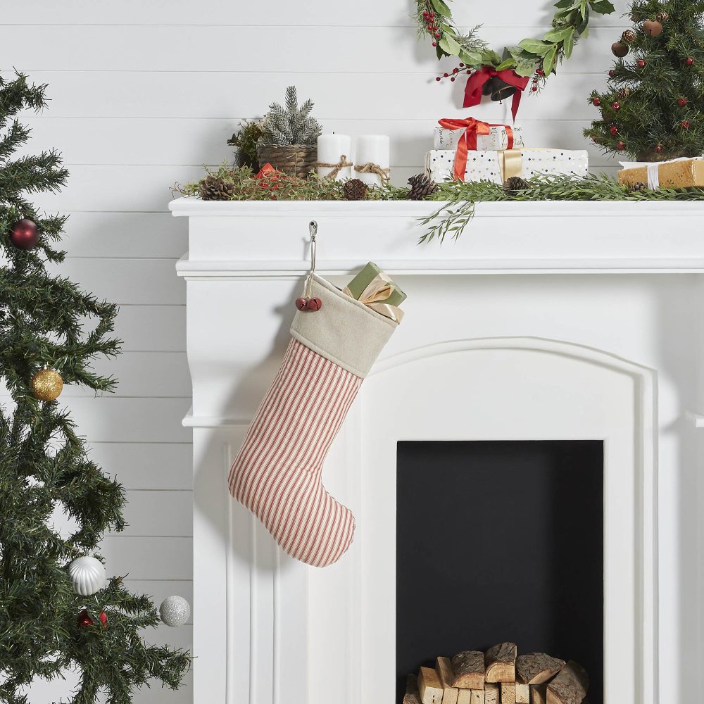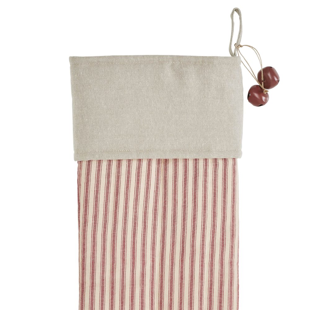 Craft the perfect vintage farmhouse Christmas look with this simple yet elegant stocking. The Sawyer Mill Red Ticking Stripe Stocking features a red and tan ticking stripe base for a simple retro look. A coordinating cuff in light tan includes two red bells and a simple hanging loop. Coordinates with the Sawyer Mill Red Collection by VHC for vintage farmhouse style for the whole home.