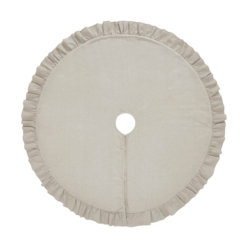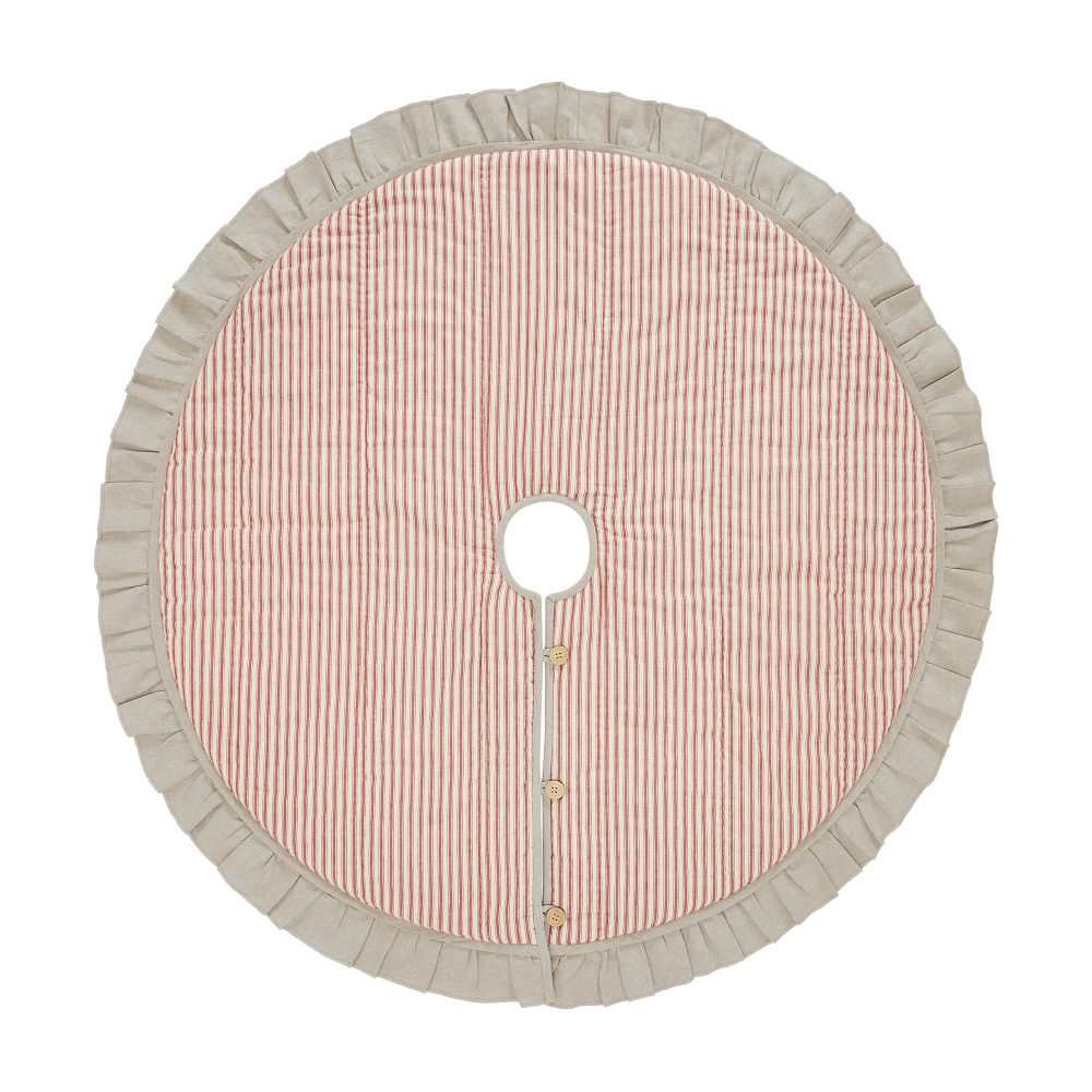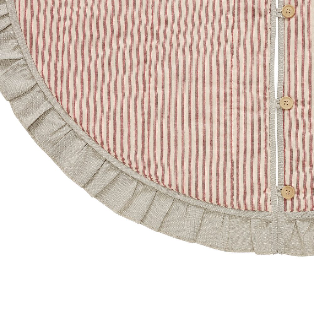 Add vintage farmhouse style to your Christmas traditions with the Sawyer Mill Red Ticking Stripe Tree Skirt. The round tree skirt features a 48 inch diameter with button style closures. A warm tan base with red ticking stripes will add simple, timeless style for a perfect farmhouse Christmas look. A deeply ruffled border in tan adds a feminine look to the design. The elegant Christmas tree skirt is made for yearly use with a quilted base. Pair with matching stockings for a complete, festive holiday look.