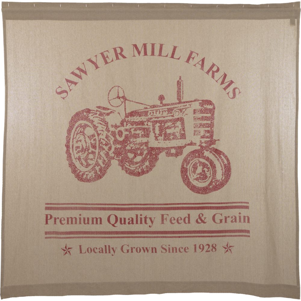 Depicting a weathered tractor in a vintage fashion with the words "Sawyer Mill Farms" above it, the Sawyer Mill Red Tractor Shower Curtain lends country appeal to your bath. The phrases "Premium Quality Feed & Grain" and "Locally Grown Since 1928" calls to mind the hardworking American farmland. The brick red and tan colors add warm, soothing colors to your home. Measures 72 by 72 inches to fit standard sized showers and baths. Easily hang this classic country bath curtain with shower hooks of your choosing (not included) using the button holes attached. A 3" rod pocket is also available as an alternative hanging method.