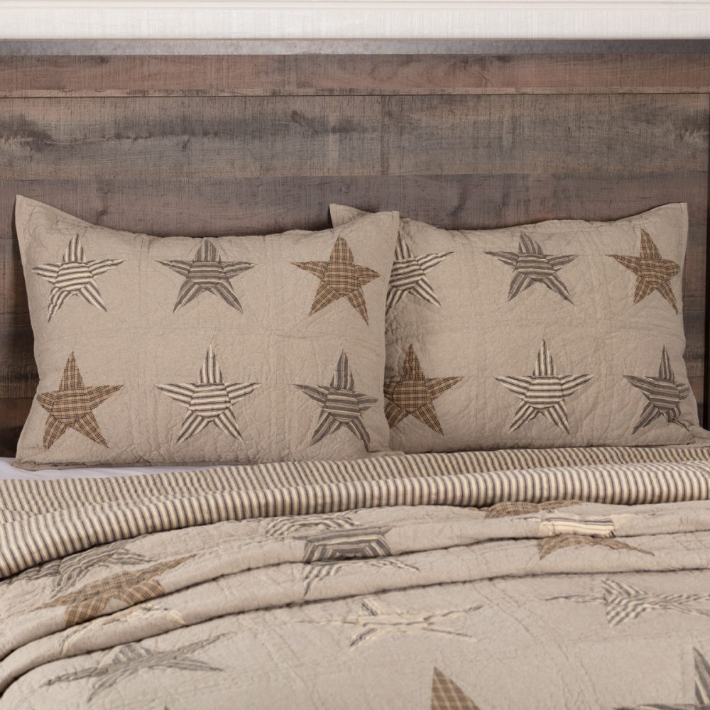 Complete the Farmhouse look and accessorize your bed with the Sawyer Mill Star Charcoal Standard Sham. Showcasing 6 country stars, each alternating in ash grey, creme, and black fabrics on textured khaki chambray cotton base. Reverses to dark creme and charcoal grey grain sack striped cotton.