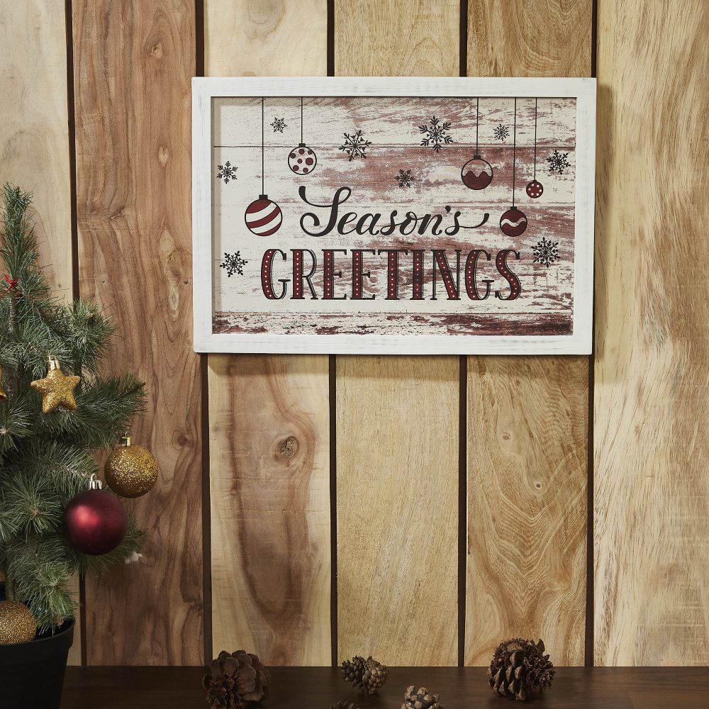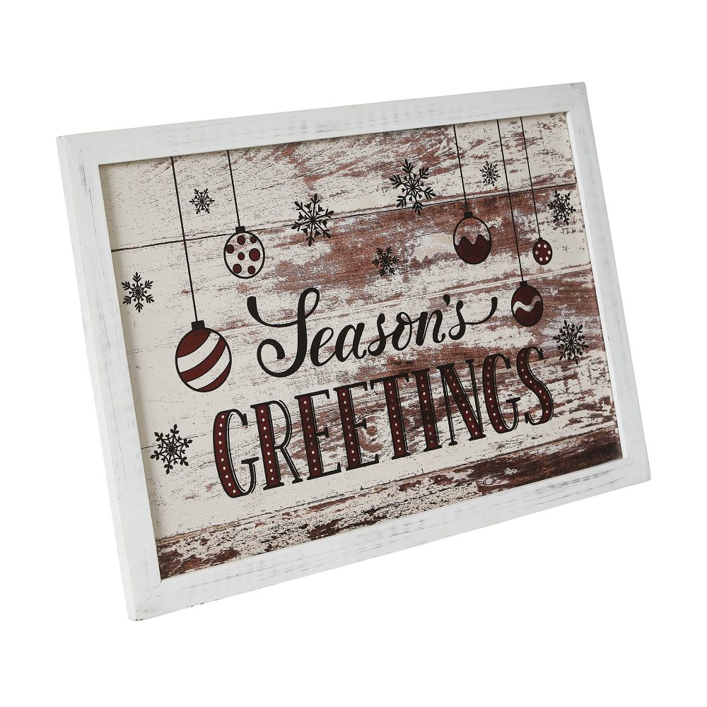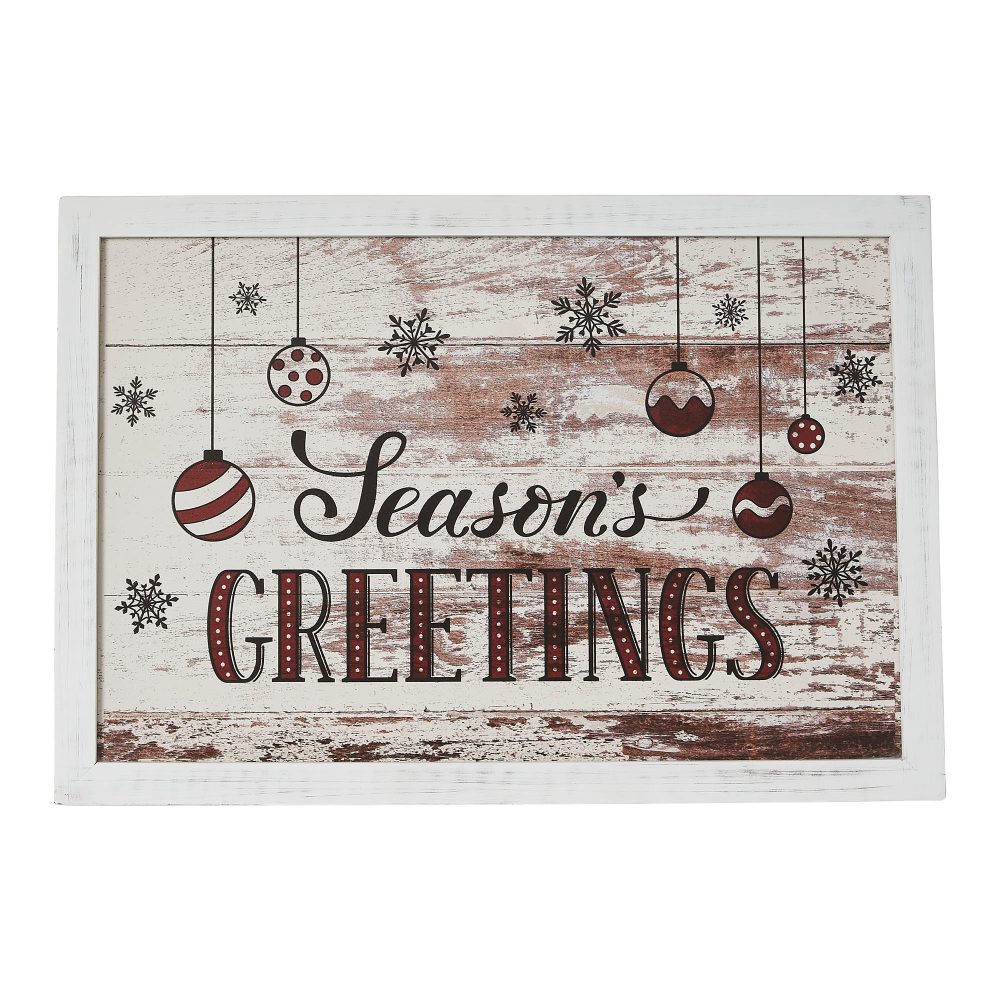 - Enhance your holiday decor with this charming wall hanging sign, measuring 11×16 inches, adorned with the festive message “Season’s Greetings” accompanied by hanging ornaments and delicate snowflakes.