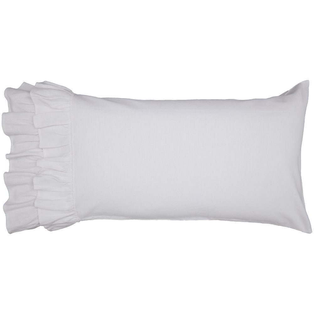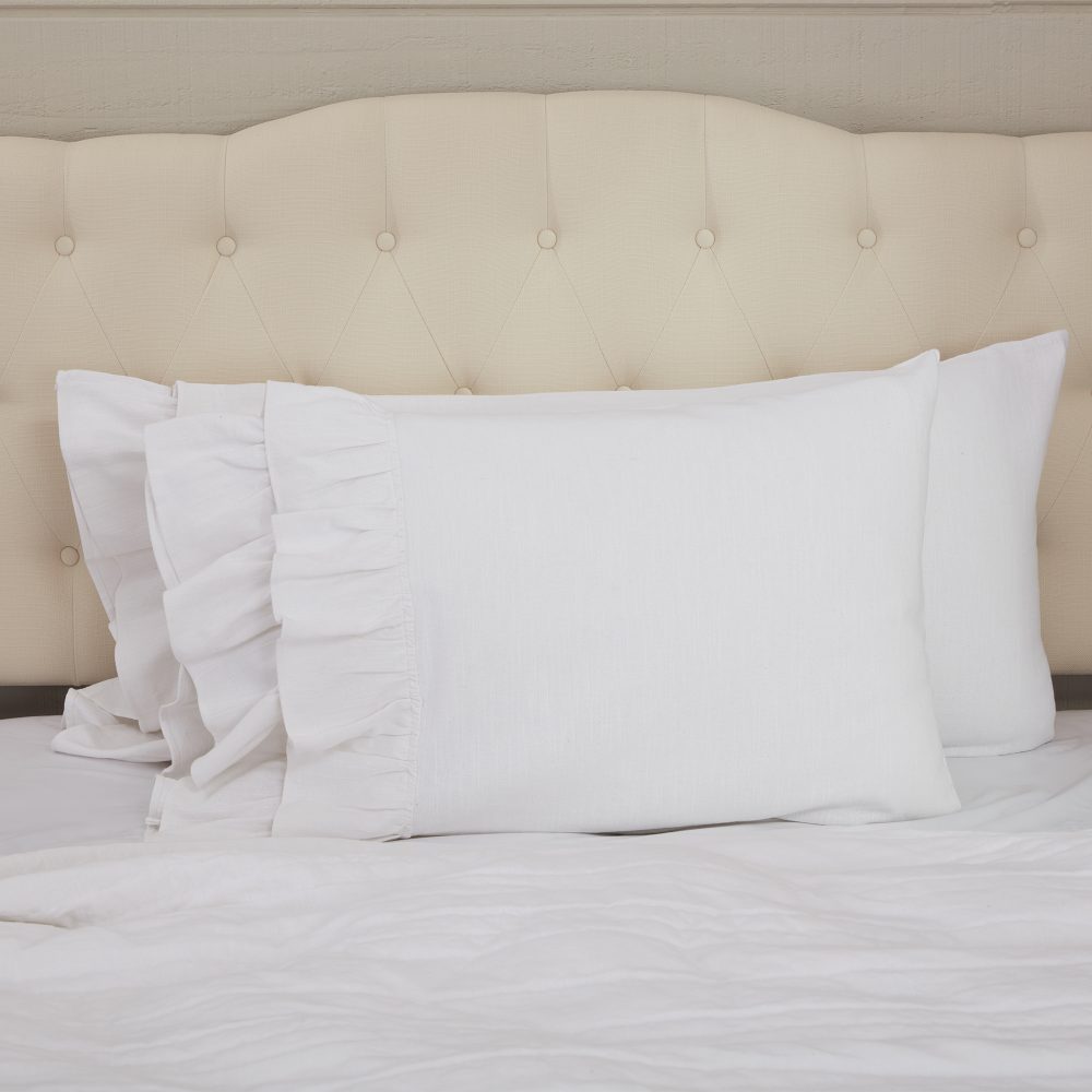 The rustic elegance and casual sophistication of the Serenity Collection bring home the farmhouse feel you want right now. The crisp white tone is guaranteed to brighten your bedroom and the luxurious ruffles add flirty, feminine appeal. There are two lavish rows of ruffles accenting the open edge of the pillowcases. Each ruffle measures 5 long with the top ruffle slightly overlapping the other by .5. The easy-going neutral tone will blend seamlessly with your bedding, no matter what your color choices or decorating style. The collection features cotton with a substantial-weight that is both durable and surprisingly soft to the touch. Set/2. Pair the pillow cases with other pieces in the Serenity Collection for a complementary, curated look. The neutral white fabric easily coordinates with many of our other collections and will blend with your existing fabrics and home decor.