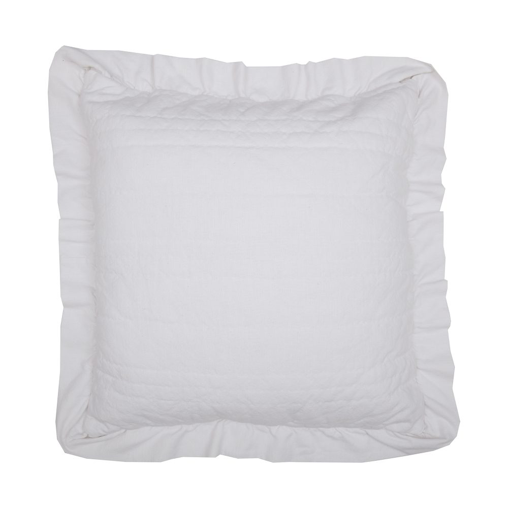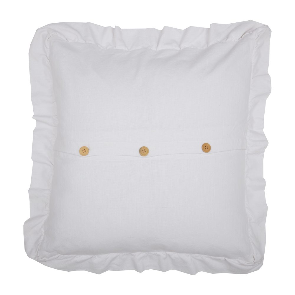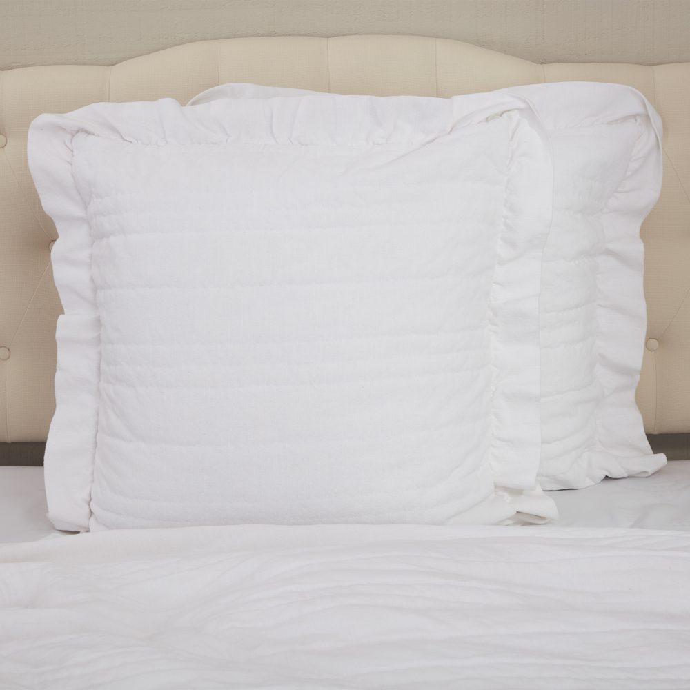 The rustic elegance and casual sophistication of the Serenity Collection bring home the farmhouse vibe right now. The crisp white tone is guaranteed to brighten your decor and the luxurious ruffles add flirty, feminine appeal and a lavish excess of fabric. The neutral sham will blend seamlessly with your bedding ensemble. The collection features cotton with a substantial-weight that is both durable and surprisingly soft to the touch. The Euro Sham is plush and cozy with three layers of fabric stitched together with channel quilting. There are three rows of straight, hand-sewn stitches in sets of three across the pillow cover and a double-layered 3 ruffle graces all sides of the pillow sham, adding layers of graceful softness to your bedroom. The cover reverses to the same cotton fabric and three natural wooden buttons keep your pillow secure. A 3 overlap of fabric is sewn at the opening, creating stability for the buttons and longer life for the sham.