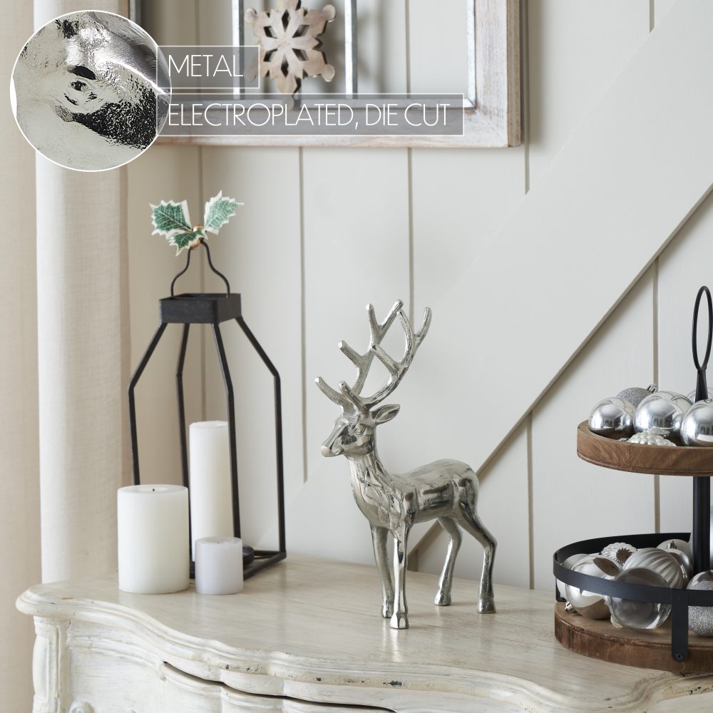 Add a gleaming touch of holiday elegance to your space with the VHC Brands Shiny Reindeer Figurine. Standing 8x12 inches, this tall, stately reindeer is crafted from metal and finished in a bright silver tone, bringing a modern sparkle to traditional Christmas decor. The textured detailing along its body enhances its silhouette, giving the piece depth and a handcrafted, rustic appeal. Electroplated for a polished, lasting shine, this figurine blends the warmth of primitive styling with a touch of contemporary flair. Whether featured alone or as part of a festive centerpiece, the reindeer adds height and sophistication to mantels, shelves, and holiday table displays. Its solid color finish and clean lines make it a versatile accent that complements both neutral palettes and vibrant seasonal themes. Designed to bring festive charm to any room-be it the bathroom, bedroom, dining room, entryway, kitchen, or living room-this decorative reindeer makes a graceful addition to your holiday home. Simply wipe clean with a soft cloth to keep its shine bright all season long. With its timeless look and quality craftsmanship, it's a holiday piece you'll enjoy displaying year after year.