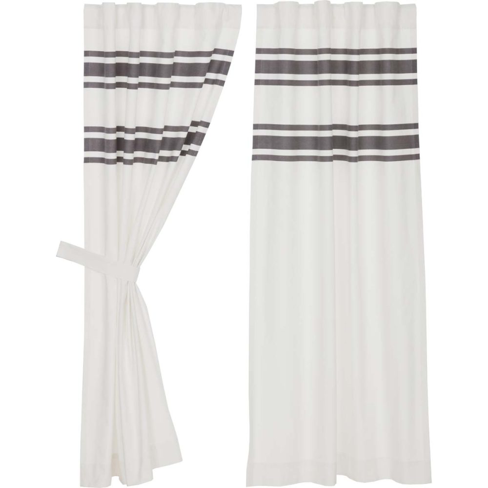 The hefty canvas in this farmhouse collection is an antique white color that drapes beautifully from curtain rings or fabric loops on the back of the curtains. The two sets of printed charcoal stripes across the top of the curtains add the perfect grain-sack detailing. Panels are sold as a pair with matching tie-backs. Machine wash in cold water, with like colors on gentle cycle. No chlorine bleach.