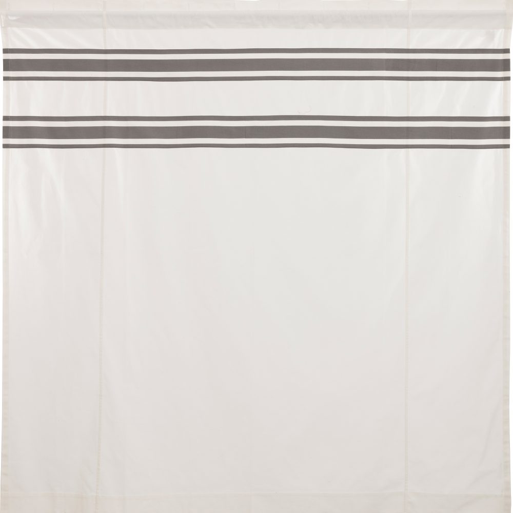 The hefty canvas in this farmhouse collection is an antique white color that drapes beautifully from standard shower curtain rings or use the rod pocket on a shower curtain tension rod. The printed charcoal stripes across the top of the curtain add the perfect grain-sack detailing. Machine wash in cold water, with like colors on gentle cycle. No chlorine bleach.