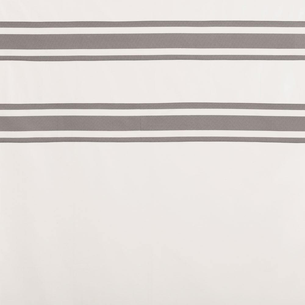 • Textured soft white cotton duck cloth; Two charcoal grey grainsack stripes stenciled horizontally across top. Features 1 button holes and rod pocket for optional hanging.
