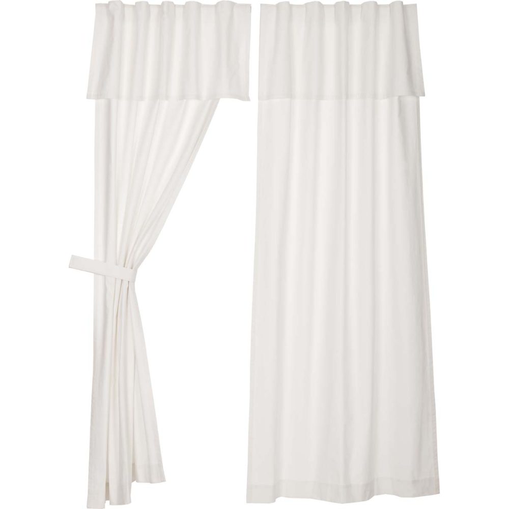 - Textured soft white cotton duck cloth; Valance attached at top of panel, covering rod pocket; Hem fold; Includes 2 matching tie backs; Machine stitched.