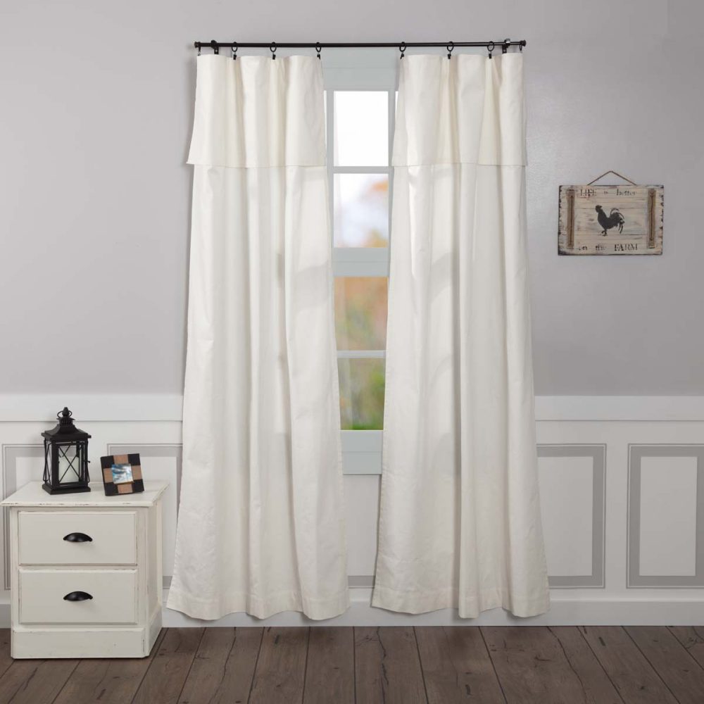 The hefty canvas fabric in this farmhouse collection is an antique white color that drapes beautifully from curtain rings or fabric loops on the back of the curtains. The warm tone will blend beautifully with your existing country, farmhouse decor. No need to wonder how to add dimension and softness to your windows when you choose the Valance Panels. Each panel comes with an attached valance that covers the rod pocket, creating decorator style in an instant.