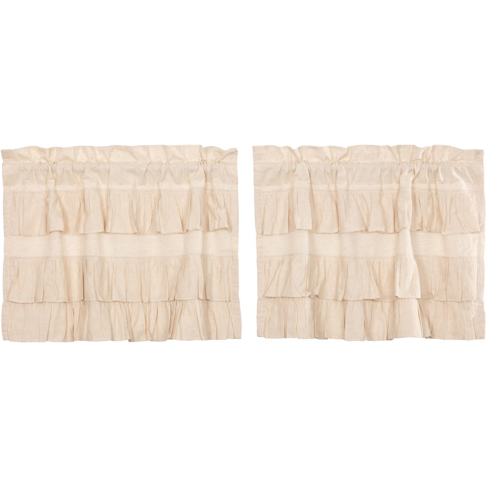 Create the perfectly charming country window of your dreams with these 24x36 inch tier-style curtains. Featuring naturally textured creamy ivory linen and romantic ruffling, the Simple Life Flax Natural Ruffled Tier Set provides just the right balance of privacy and sunshine. Pair with a matching valance or prairie swag for a fully decorated look or alone for a simple pop of texture and character. Also known as cafe or bistro curtains, these are a particularly good fit for decorating vintage kitchens, laundry rooms, and small bathroom windows.