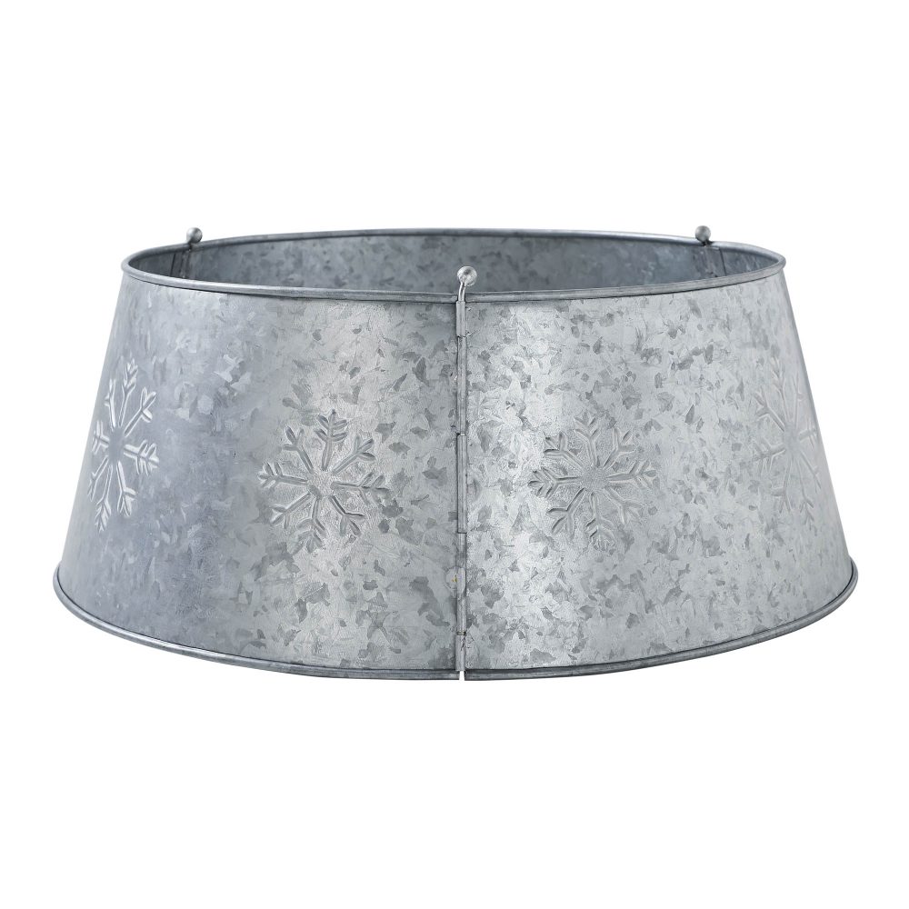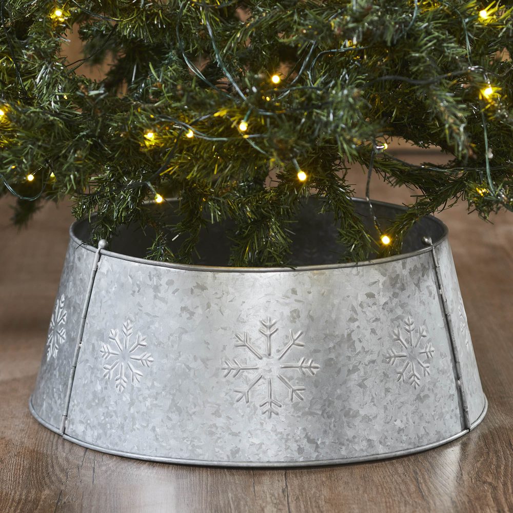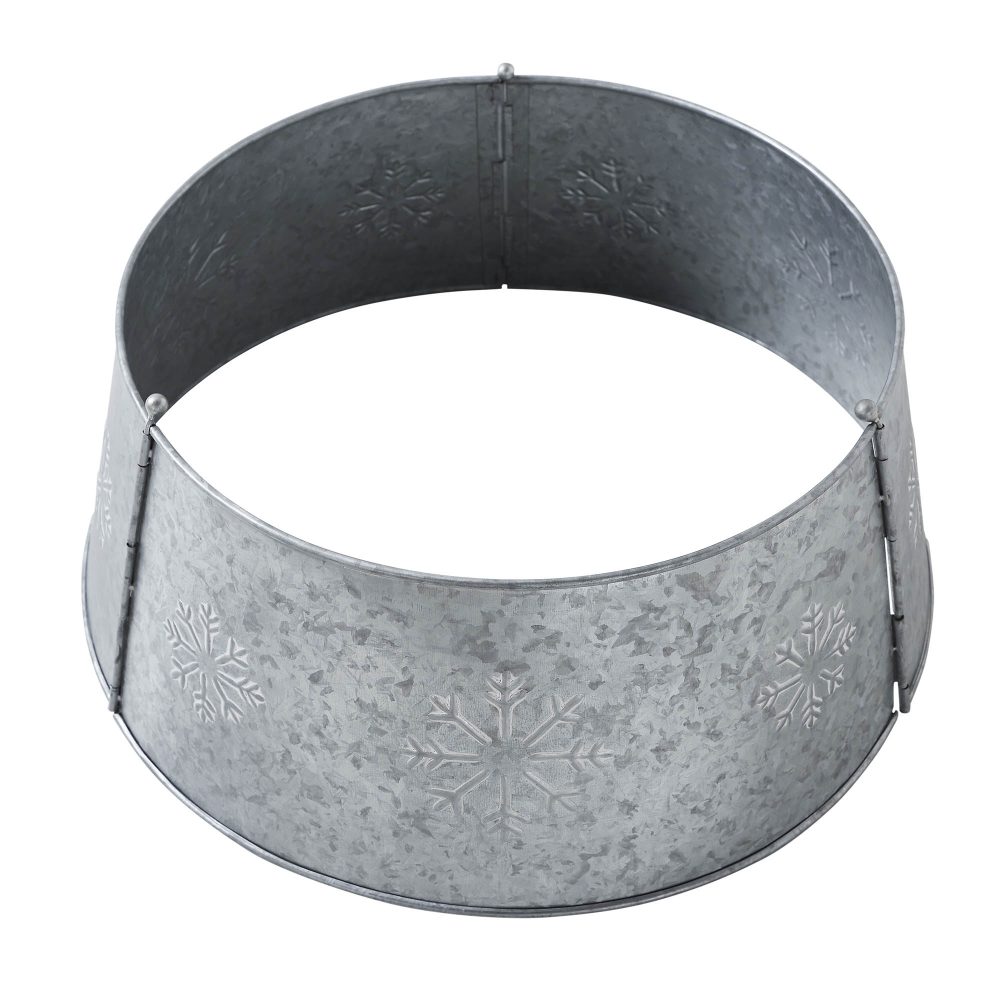 - Presenting the VHC Brands Metal Snowflake Christmas Tree Collar in a stylish Metal Grey (Galvanized) finish, offering a modern yet rustic touch to your holiday decor with its charming design.
