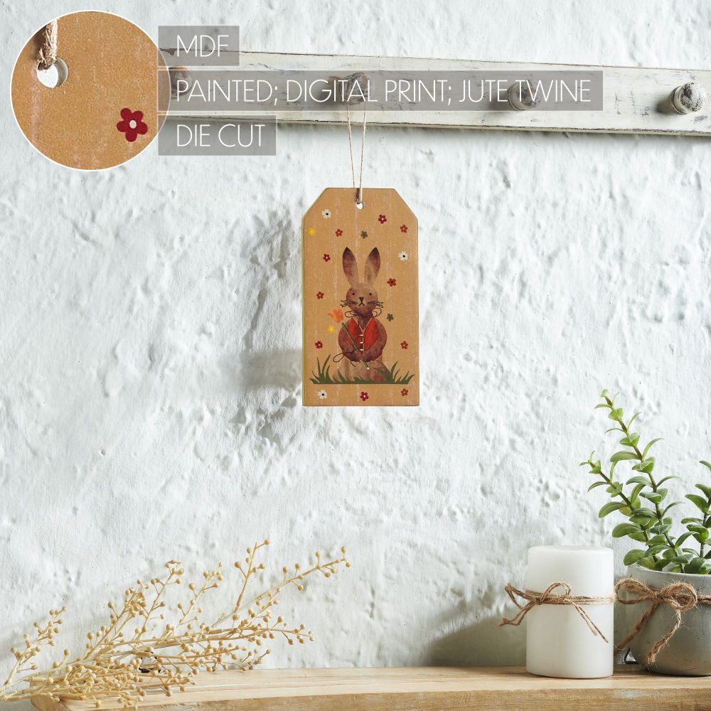 Introduce a touch of whimsy and charm to your home with the VHC Brands Spring In Bloom Bunny In Vest MDF Tag Ornament. Measuring 3.75x7 inches, this delightful ornament is crafted from durable MDF, making it a long-lasting addition to your spring and Easter decorations. The design features an endearing bunny dressed in a vest, holding a flower, and surrounded by a shower of spring blooms, all set against a fall leaf tan background. The digital print captures every detail beautifully, while the distressed appearance adds a rustic, primitive charm to your decor. This versatile ornament is perfect for enhancing the seasonal ambiance in any room of your home. Whether you place it in the bathroom, bedroom, dining room, entryway, kitchen, or living room, the charming bunny and flower design will bring a smile to your face and a sense of springtime joy to your space. The color palette of fall leaf tan, bunny brown, and moss green complements a variety of decor styles, particularly those that embrace a farmhouse or country theme. The attached twine makes it easy to hang, adding a delightful accent to any area. Maintaining the VHC Brands Spring In Bloom Bunny In Vest MDF Tag Ornament is simple, requiring just a quick wipe with a soft cloth to keep it looking fresh and vibrant. This easy care routine ensures that the ornament remains a cherished part of your seasonal decorations for years to come. Whether you're looking to add a unique touch to your own home or searching for a thoughtful gift, this ornament is sure to delight and enhance the festive spirit of spring and Easter.