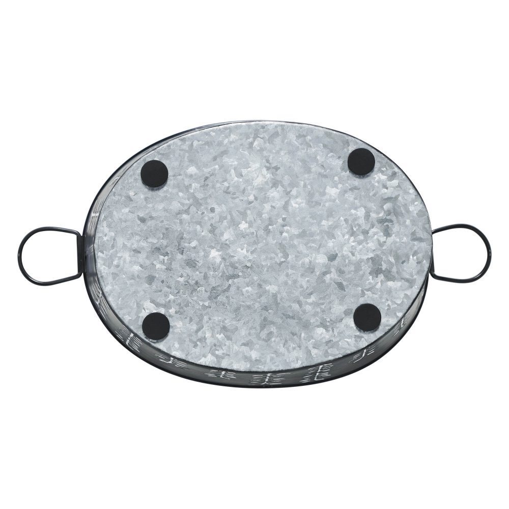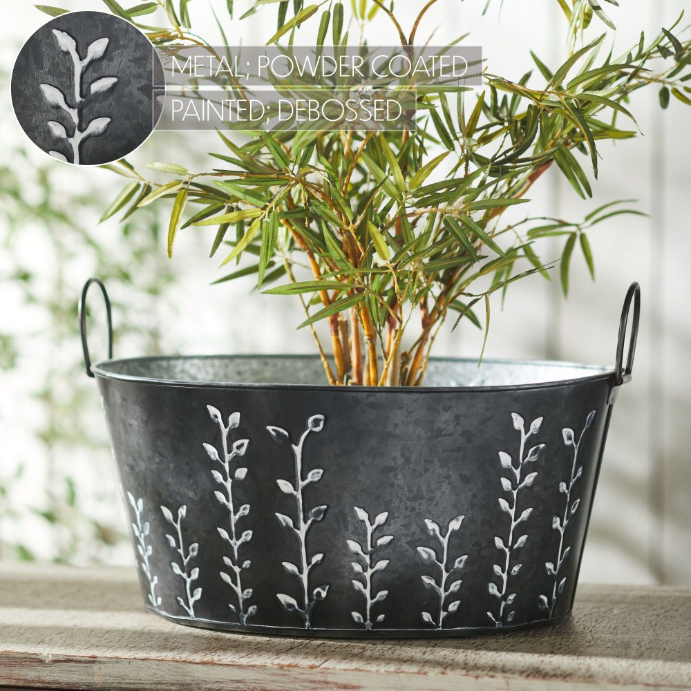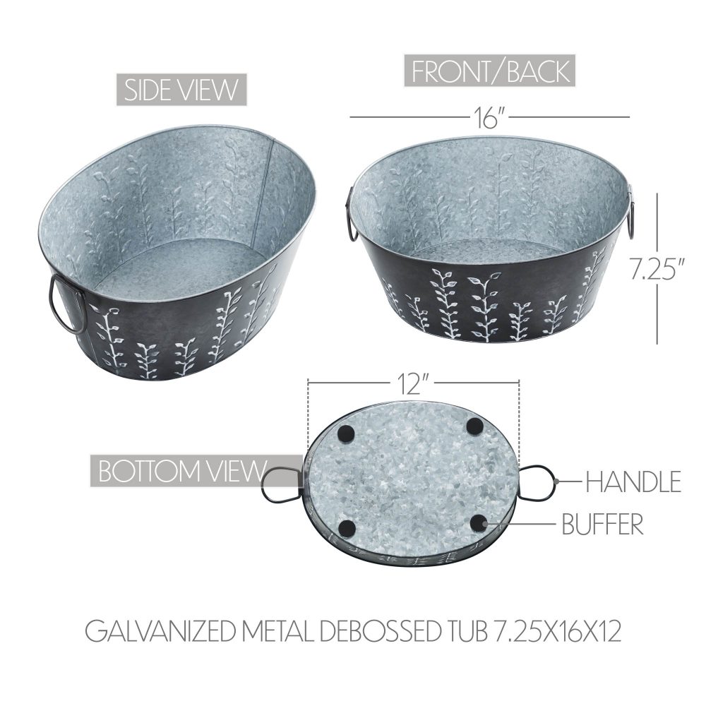 Introduce a rustic touch to your spring decor with the VHC Brands Spring In Bloom Galvanized Metal Debossed Tub. This beautifully crafted metal container measures 7x16 inches and features a rich pecan brown shade, adorned with intricate debossed vines that trail up the sides. The design is complemented by subtle accents of faded creme and galvanized grey, adding to its country garden charm and distressed appearance. This round decorative tub is perfect for adding a vintage farmhouse feel to any room. While it is intended for decorative purposes only and is not suitable for holding food or water, it serves as an ideal container for displaying artificial flowers, dried arrangements, or other seasonal decor. The solid color and detailed vine patterns enhance its primitive and rustic aesthetic, making it a versatile addition to your home decor. Whether placed in the bathroom, bedroom, dining room, entryway, kitchen, or living room, this tub brings a warm and inviting element to your space. Easy to maintain with a simple wipe from a soft cloth, the VHC Brands Spring In Bloom Galvanized Metal Debossed Tub is a delightful way to celebrate the beauty of spring and add a touch of elegance to your seasonal decorations.