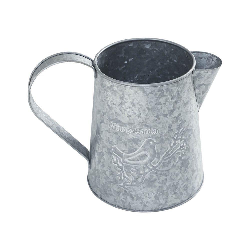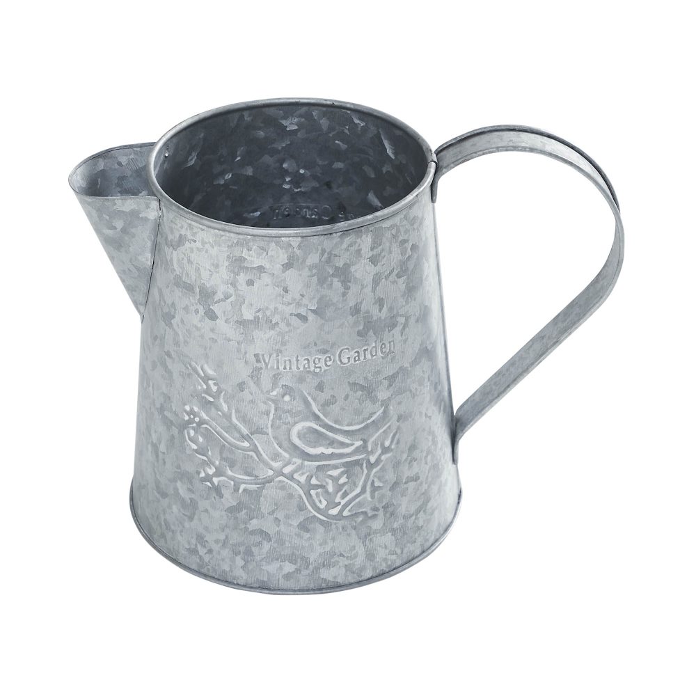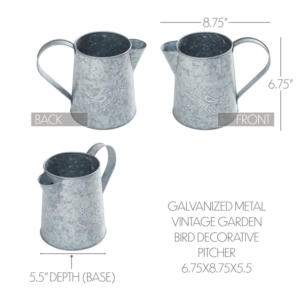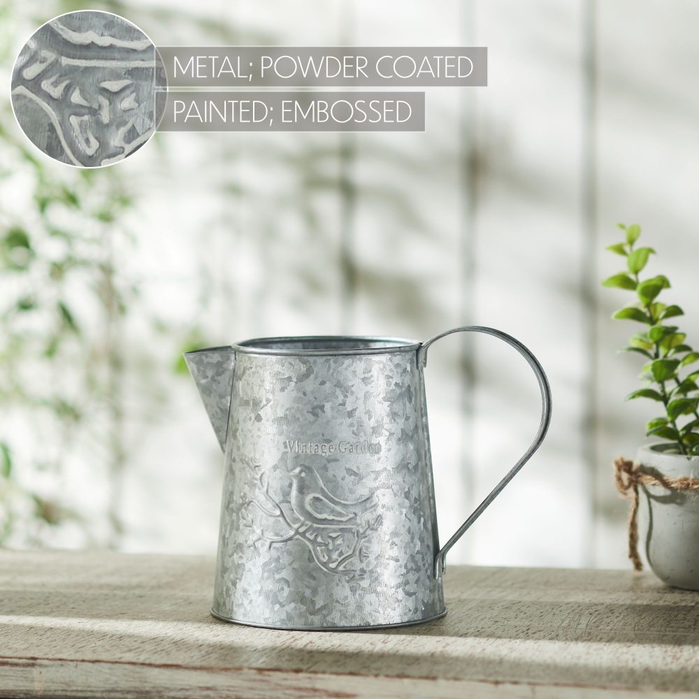 Enhance your spring decor with the VHC Brands Spring In Bloom Galvanized Metal Vintage Garden Bird Decorative Pitcher. Measuring 6.75x8.75 inches, this charming pitcher is crafted from galvanized metal, featuring the phrase "Vintage Garden" elegantly displayed above a detailed bird perched on a branch. The design, set against a galvanized grey background, adds a touch of rustic charm and vintage appeal to your home. This round pitcher is perfect for decorative purposes, making it an ideal vessel for showcasing artificial or dried flowers. It can also be used with fresh flowers, but please ensure it is not filled with water beyond 60% of its capacity to maintain its pristine condition. The distressed appearance and solid color enhance its primitive and country garden aesthetic, making it a versatile piece that complements various interior styles. Whether placed in the bathroom, bedroom, dining room, entryway, kitchen, or living room, this decorative pitcher brings a touch of nature's beauty indoors. Its easy-to-maintain design requires only a simple wipe with a soft cloth to keep it looking fresh and appealing. The VHC Brands Spring In Bloom Galvanized Metal Vintage Garden Bird Decorative Pitcher is a delightful addition to your spring and Easter decorations, celebrating the season with a timeless and elegant style.