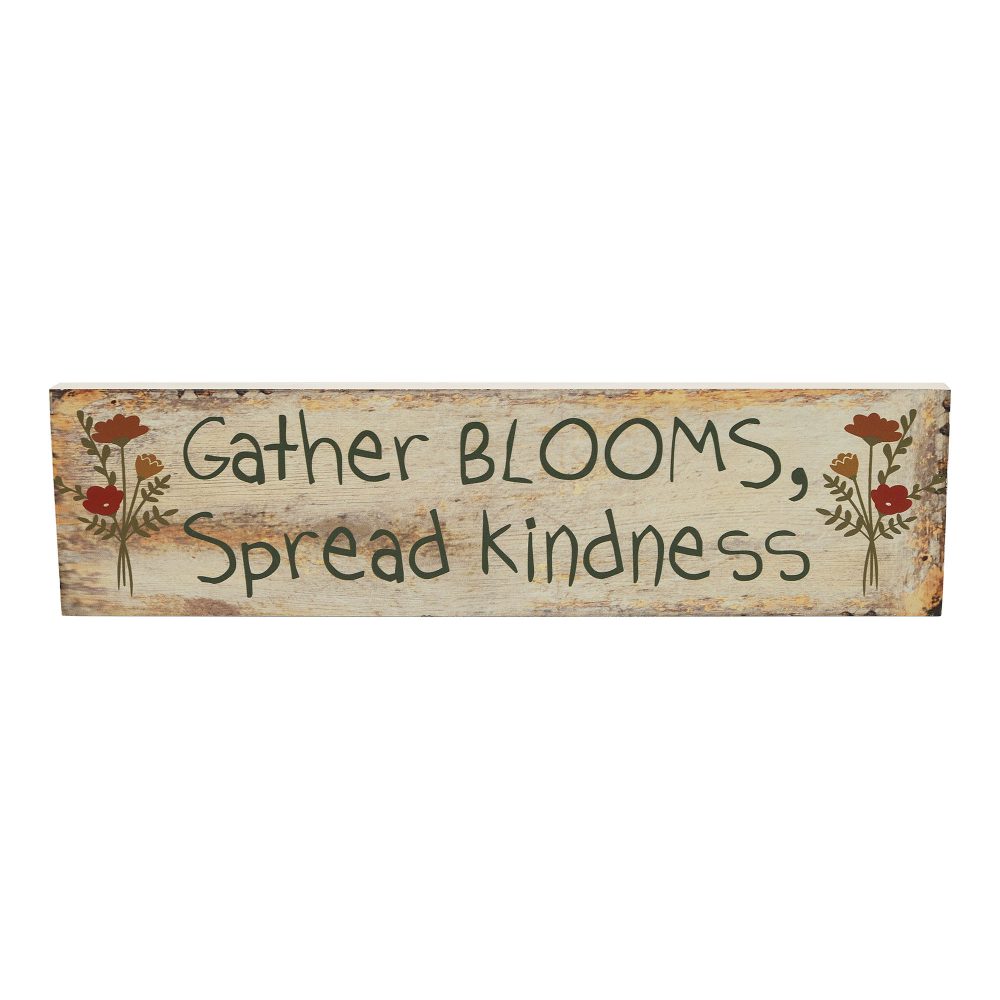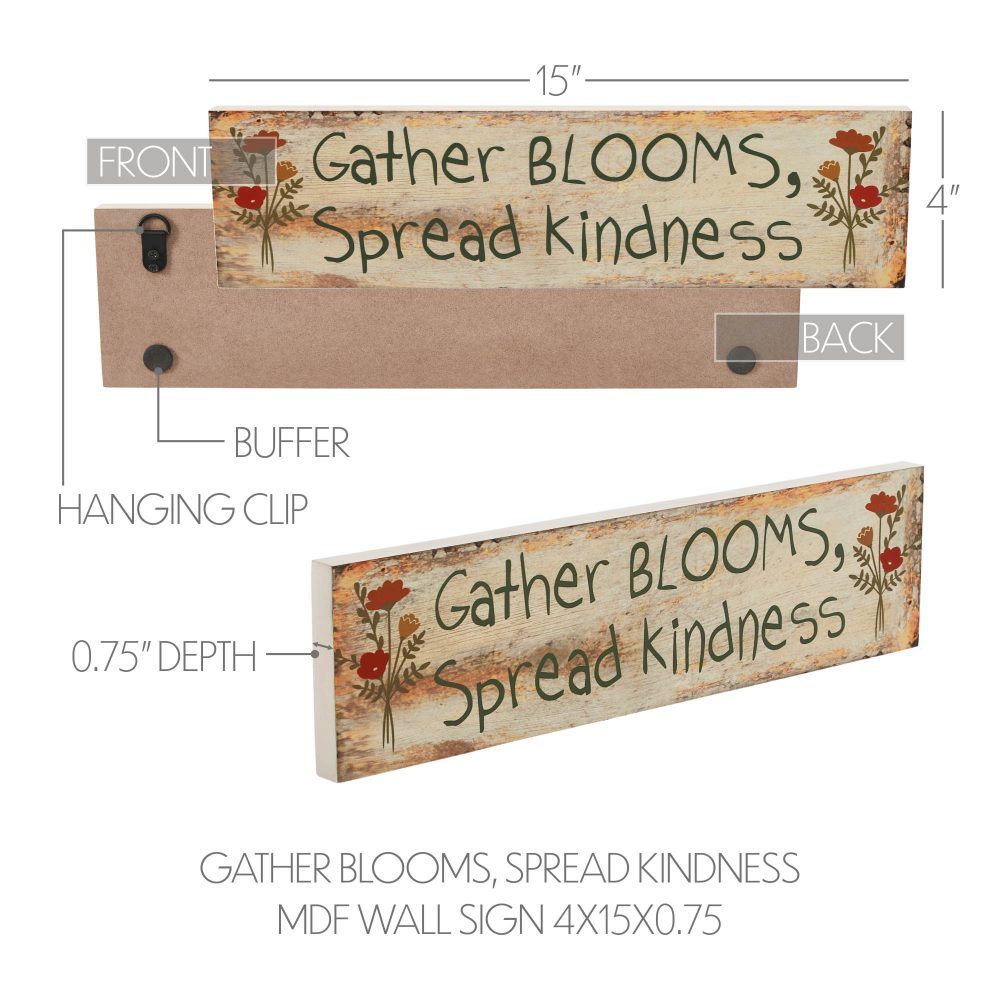 The VHC Brands Spring In Bloom Gather Blooms, Spread Kindness MDF Wall Sign is a charming addition to any spring decor. Measuring 4x15 inches, this rectangular sign features the uplifting phrase "Gather Blooms, Spread Kindness" in a soothing cypress green, beautifully complemented by vibrant spring bouquets in sangria pink and burnished gold. The design is set against a distressed tan background, giving it a rustic and primitive touch that enhances its springtime appeal. Crafted from MDF, this sign is not only a delightful decorative piece but also easy to maintain. The digital print ensures the colors remain vivid and the text clear, while the distressed appearance adds a vintage charm to your home. Whether you place it in your bathroom, bedroom, dining room, entryway, kitchen, or living room, it adds a touch of warmth and positivity to your space. Ideal for celebrating the spring season, this wall sign encourages both the gathering of blooms and the spreading of kindness. Its versatile design fits seamlessly into various decor styles, making it a perfect choice for adding a bit of spring cheer to any room. Simply wipe clean with a soft cloth to keep it looking fresh throughout the season.