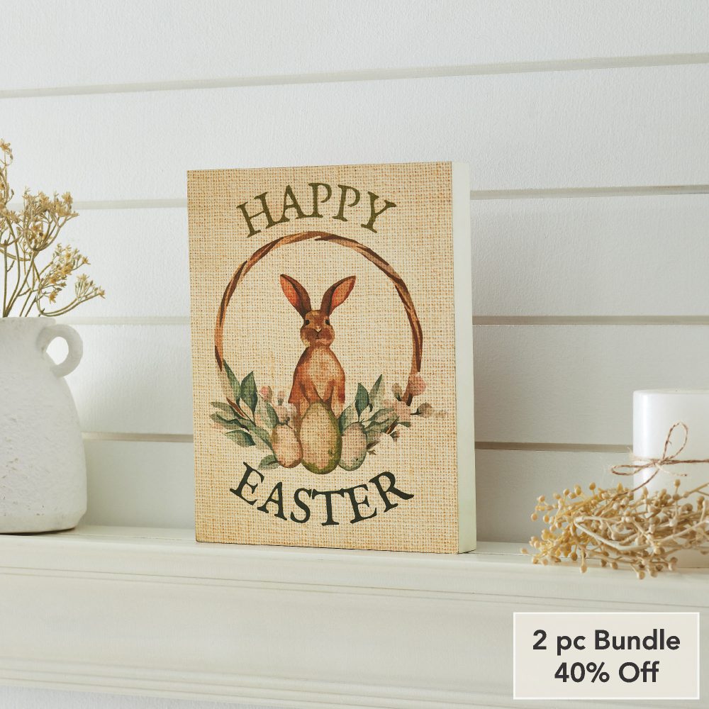 - Sku – 88600 – Spring In Bloom Happy Easter Bunny & Eggs In Wreath MDF Wall Sign 10x8x1 (2 Packages)