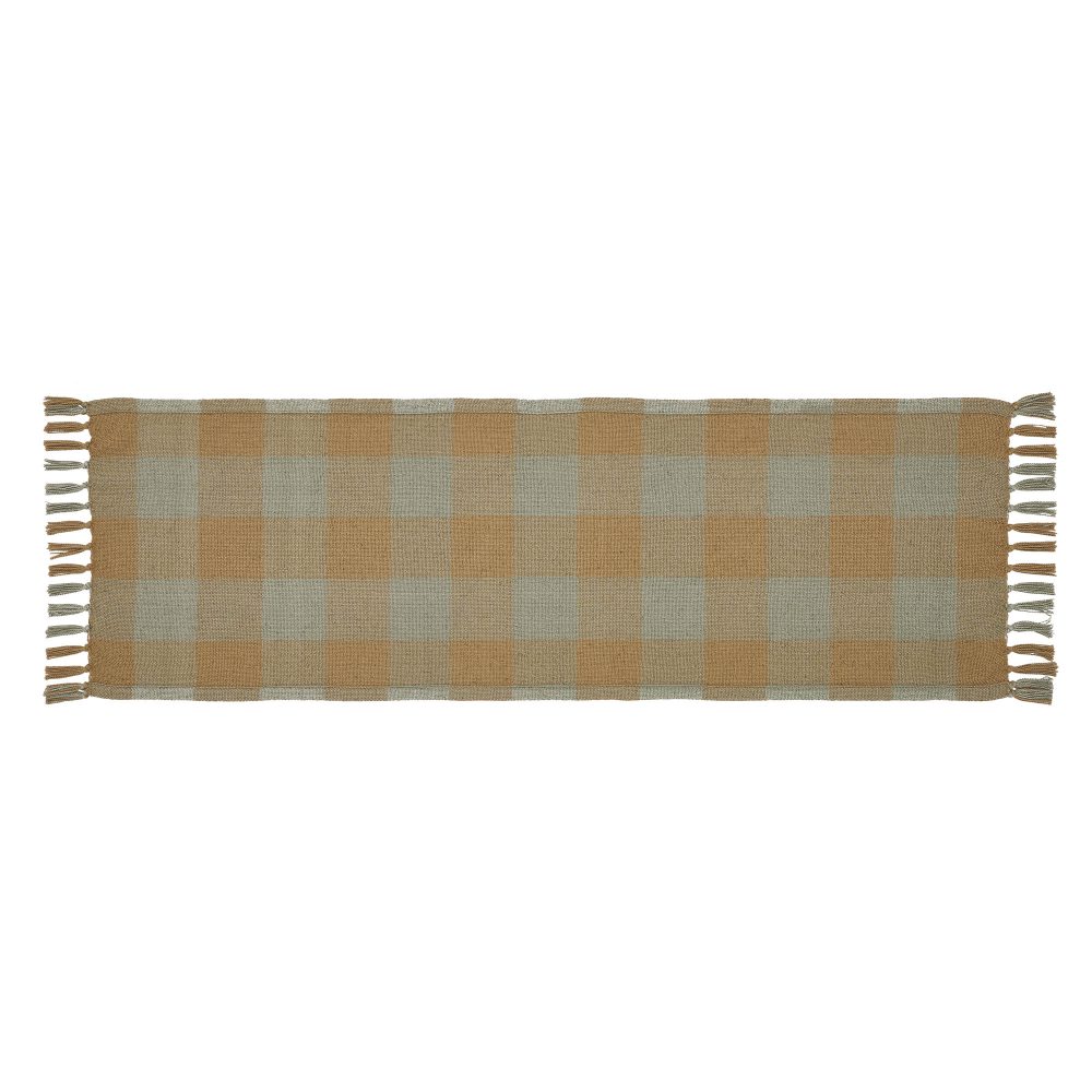 Elevate your farmhouse-style kitchen or dining area with the VHC Brands Spring In Bloom Indoor/Outdoor Runner. This 12x36 table runner in Golden Tan and Laurel Green boasts a charming Primitive Check pattern, infusing a touch of rustic country charm into your space. Crafted from recycled PET, it offers durability and eco-friendliness, suitable for both indoor and outdoor use. Inspired by the serene beauty of the river, the Spring In Bloom Collection showcases a woven design, adding character and warmth to your decor. Measuring 12x36 inches, this runner is a versatile addition that complements both small coffee tables and long dining tables. With mission-style accents and the trusted VHC quality, it's the perfect choice for enhancing your farmhouse aesthetic and creating a welcoming atmosphere for gatherings with family and friends. The VHC Brands Spring In Bloom Indoor/Outdoor Runner is designed to seamlessly blend style and functionality. Whether you're enjoying a quiet coffee morning or hosting friends and family, this runner sets the stage for a warm and inviting ambiance while adding a touch of country elegance to your home.