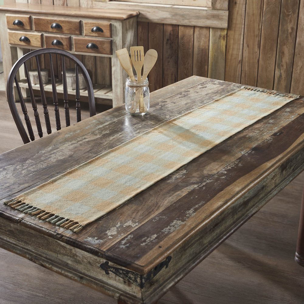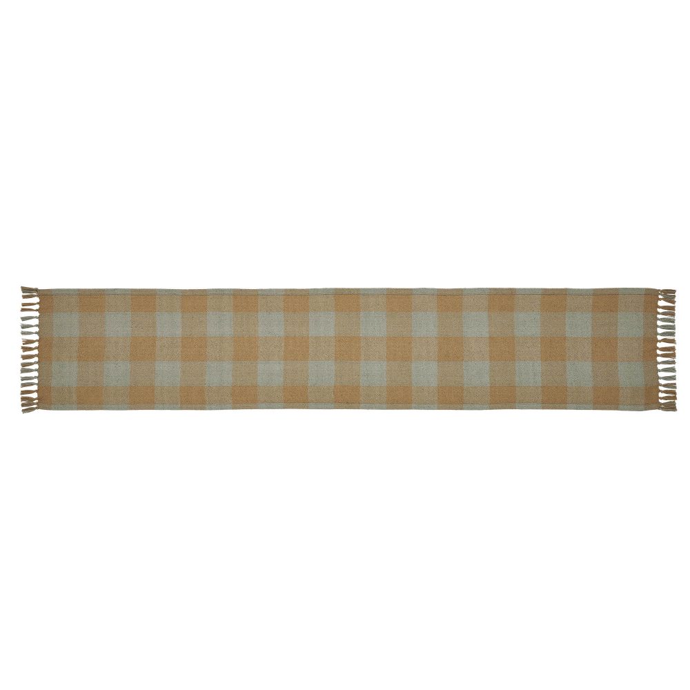 Elevate your farmhouse kitchen or dining space with the VHC Brands Spring In Bloom Indoor/Outdoor Runner, measuring 12x60 inches. This Golden Tan and Laurel Green table runner boasts a charming Primitive Check pattern, infusing a rustic country touch into your decor. Crafted from recycled PET, it offers both durability and eco-friendliness, suitable for both indoor and outdoor use. Inspired by the serene beauty of the river, the Spring In Bloom Collection showcases a woven design, adding character and warmth to your space. This versatile 12x60 runner complements small coffee tables and long dining tables with ease, featuring mission-style accents and the trusted VHC quality. It's the perfect choice for enhancing your farmhouse style and creating a welcoming atmosphere for gatherings with family and friends. The VHC Brands Spring In Bloom Indoor/Outdoor Runner seamlessly combines style and functionality, making it ideal for both quiet coffee mornings and hosting friends and family. Set the stage for a warm and inviting ambiance while adding a touch of country elegance to your home with this runner.