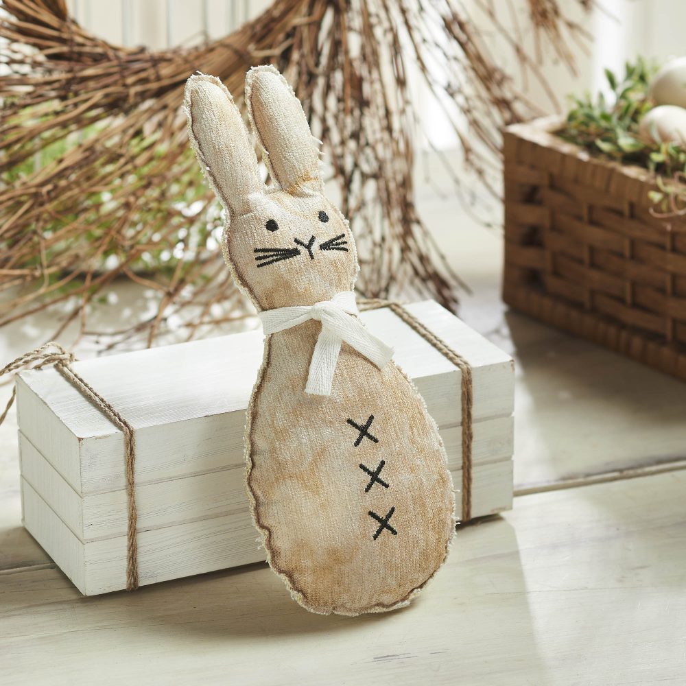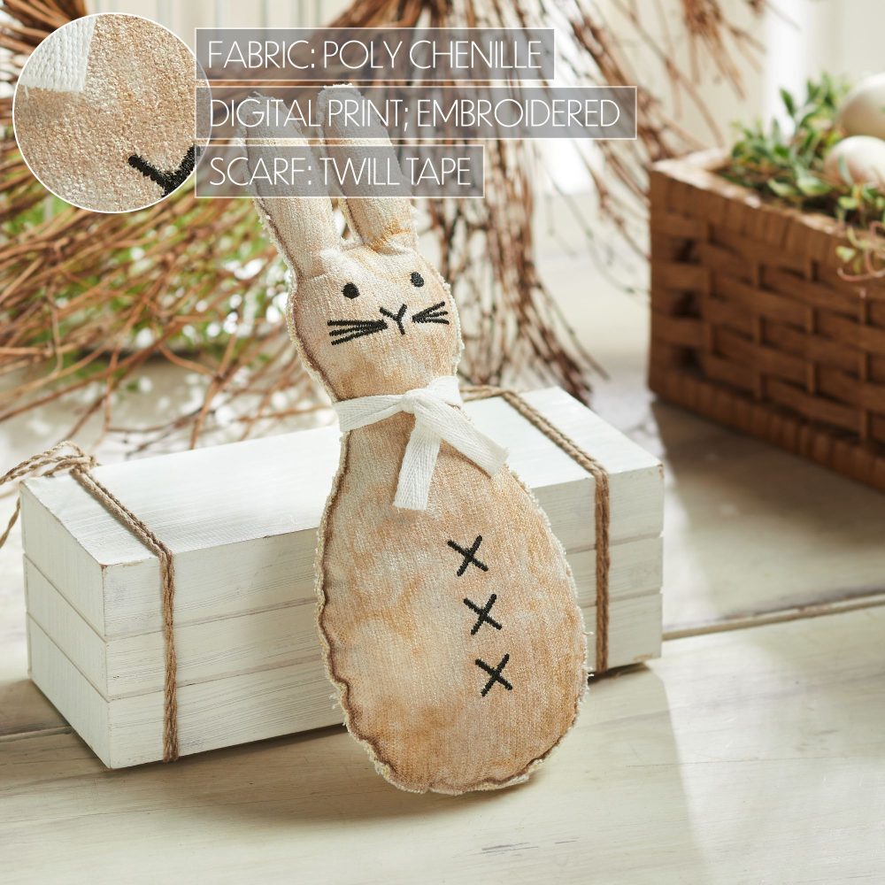 Welcome the charm of spring into your home with the VHC Brands Spring In Bloom Scarfed Primitive Bunny Pillow. This adorable 5x12 pillow features a bunny design in a distressed tea stain style, capturing the essence of rustic decor. The bunny is adorned with a creme scarf and detailed with rich black embroidered accents, enhancing its quaint and primitive appeal. Its mottled, tea stain brown and antique white colors create a warm, inviting look, perfect for any cozy nook or as a delightful accent on your furniture. This decorative pillow effortlessly adds a touch of whimsy and vintage charm to your spring and Easter decor. It's ideally sized for various placements, from a welcoming touch in the entryway to a playful addition in the living room, bedroom, or even the dining room. The unique primitive attic treasure design brings a nostalgic feel to your home, blending beautifully with both traditional and contemporary settings. Maintaining the Spring In Bloom Scarfed Primitive Bunny Pillow is easy, requiring only spot cleaning to preserve its distressed appearance and intricate embroidery. This low-maintenance approach ensures that the pillow remains a cherished part of your seasonal decor year after year, continuously bringing a smile and a hint of springtime magic to your home. Whether used as a solo statement or part of a larger decorative theme, this pillow is sure to capture hearts and enhance the festive spirit of the season.