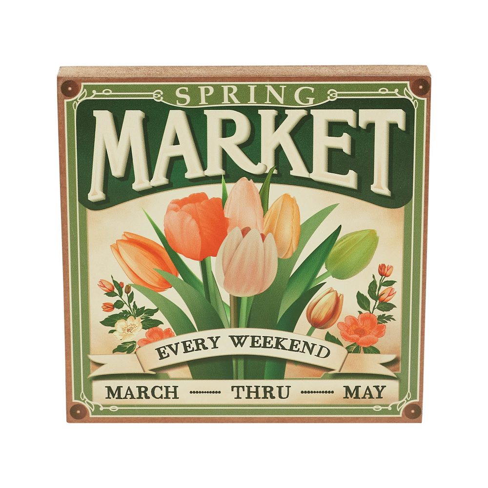 Celebrate the vibrant charm of spring with the VHC Brands Spring In Bloom Spring Market Flowers Sale MDF Block Sign. Measuring 8x8 inches, this square sign features a delightful announcement: "Spring Market Every Weekend March Thru May." The text is accompanied by a bouquet of tulips in refreshing shades of green, peach, and creme, adding a touch of floral elegance to the design. Crafted from MDF and adorned with a digital print, this sign combines functionality with seasonal cheer. The cypress green, light creme, and peach hues bring a lively, farmhouse-inspired look that fits seamlessly into a variety of decor styles. The distressed appearance enhances its rustic appeal, making it a perfect addition to any spring-themed setting. Easy to maintain, this sign requires just a simple wipe with a soft cloth to keep it looking its best. Its versatile design makes it suitable for display in your bathroom, bedroom, dining room, entryway, kitchen, or living room. The VHC Brands Spring In Bloom MDF Block Sign is an inviting way to usher in the spring season and celebrate the joy of local markets and fresh flowers.