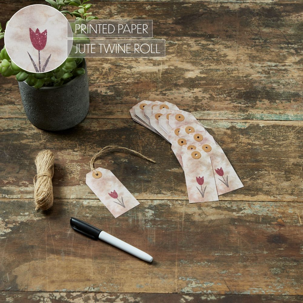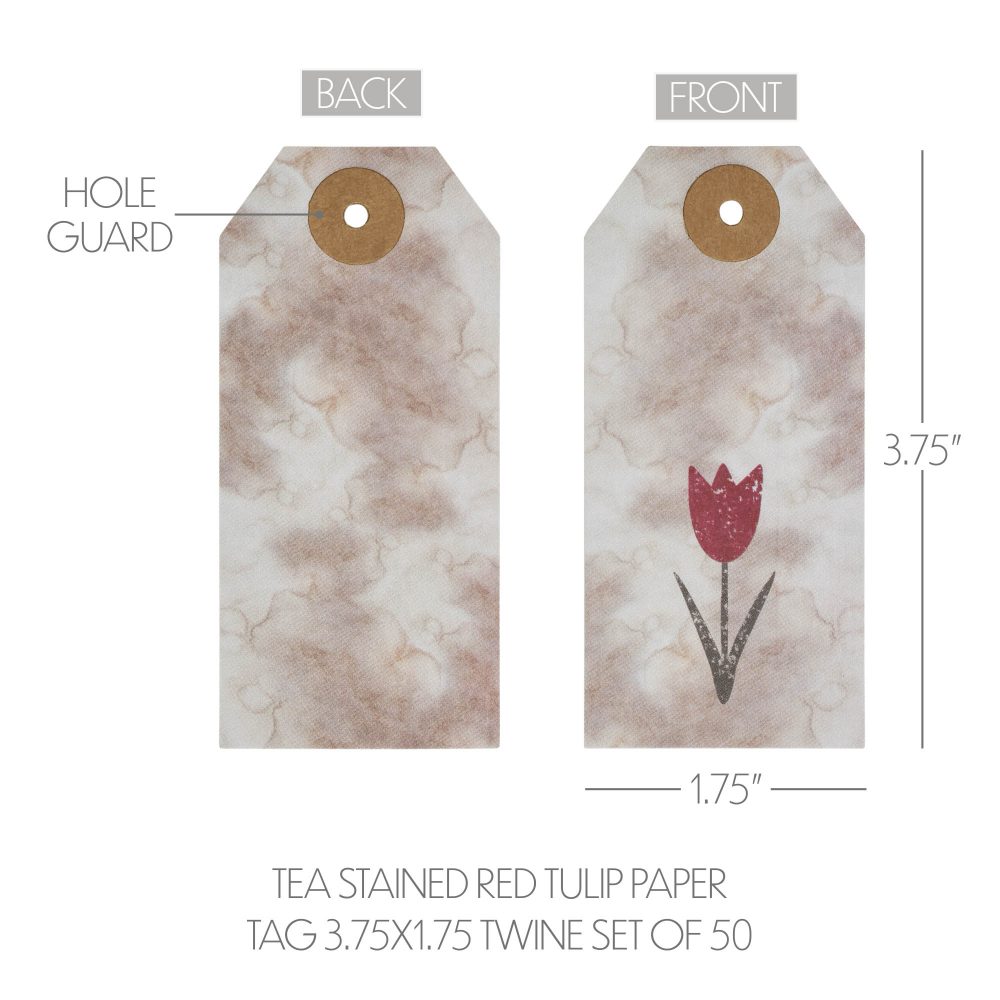 Introducing the VHC Brands Spring In Bloom Tea Stained Red Tulip Paper Tag Set, a delightful addition to your spring and Easter decor. This set includes 50 paper tags, each measuring 1.75x3.75 inches, designed to bring a touch of vintage charm to your home. The tags feature a beautiful red tulip with a green stem, printed on a tea stain look paper that gives a warm, rustic feel. The tags come with twine for easy attachment, making them perfect for adding a personalized touch to gifts, decorating seasonal displays, or enhancing your home decor with a vintage spring aesthetic. These versatile tags are ideal for use in various areas of your home, bringing a sense of primitive and rustic charm to your decor. Whether adorning your dining room table, adding a quaint touch to your bathroom, or brightening up your kitchen and living room, the VHC Brands Spring In Bloom Tea Stained Red Tulip Paper Tags are perfect for celebrating the beauty of spring. The tea stain brown, burgundy, and cypress green colors evoke a sense of timeless elegance, complementing farmhouse and vintage decor styles. The vintage style tulip graphic adds a touch of floral beauty, making these tags a wonderful choice for your spring and Easter celebrations. Designed for practicality and durability, these tags are easy to maintain, simply wipe clean with a soft cloth to keep them looking fresh and vibrant. Whether you're using them to label homemade treats, personalize gifts, or add a decorative element to your seasonal decor, the VHC Brands Spring In Bloom Tea Stained Red Tulip Paper Tag Set is a stylish and functional addition to your home. Embrace the spirit of spring and the charm of vintage design with these beautifully crafted tags, perfect for adding a touch of elegance and warmth to any room in your home.