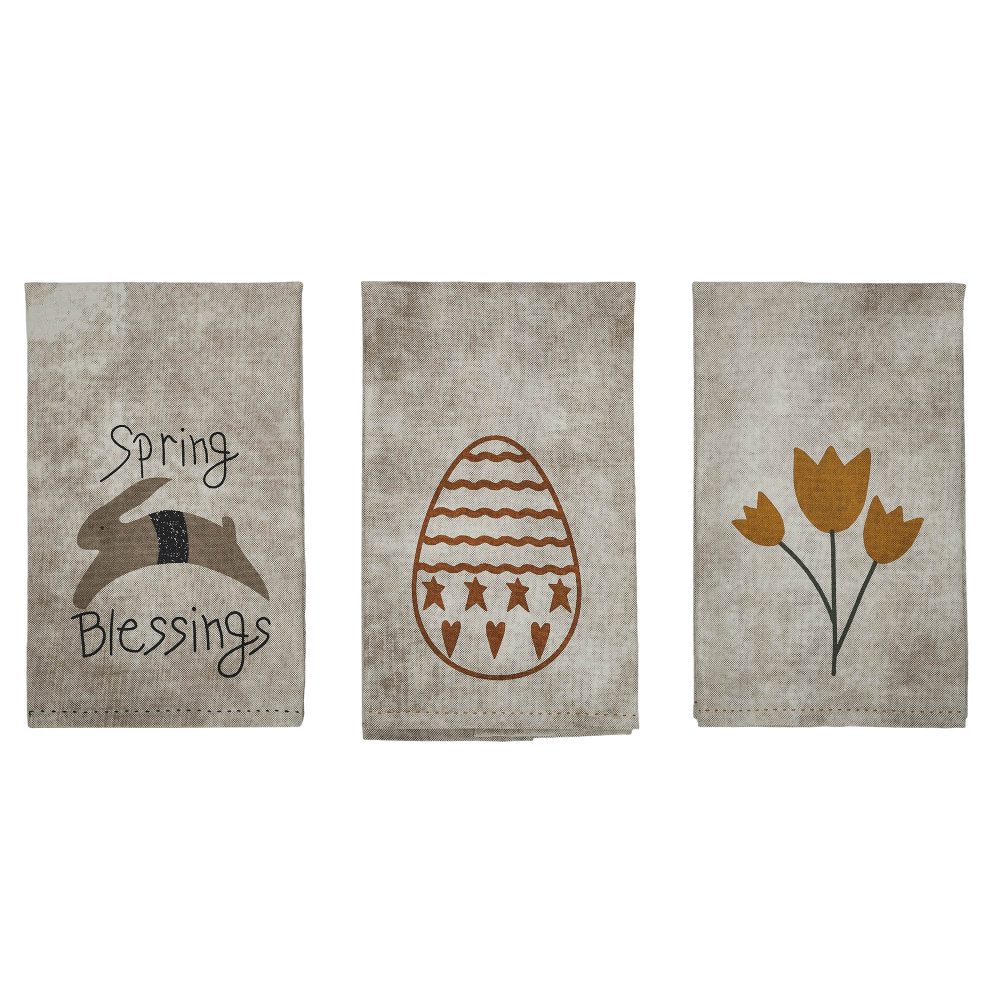 • Enhance your kitchen decor with the Spring In Bloom Collection Cotton Kitchen Towel set of 3. Featuring a primitive bunny and “Spring Blessings”, an Easter Egg and Flowers, embodying a Primitive Country style.