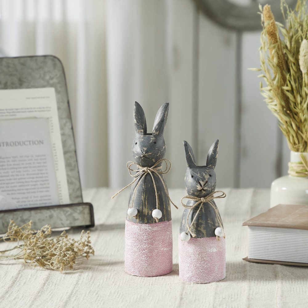 Introducing the VHC Brands Spring In Bloom Wooden Cone Bunnies, a delightful set of two charming figures designed to enhance your springtime decor. Crafted from tropical wood, these bunnies are presented in a distinctive cone shape and finished in a distressed charcoal grey. The set includes two sizes: 9.25x2.75x2.75 inches and 7.5x2.75x2.75 inches, each adorned with intricately carved whiskers and noses, adding a touch of whimsical detail. Each bunny sits atop a textured base painted in a soft rose pink, creating a pleasing contrast with the charcoal grey of the bunnies. The combination of these colors offers a rustic yet refined look, making these figures a versatile addition to any room in your home. Perfect for adding a touch of vintage charm, these cone bunnies are ideal for spring and Easter decorations. Maintenance is effortless as you can simply wipe them clean with a soft cloth to keep them looking fresh and vibrant. Whether placed in the bathroom, bedroom, dining room, entryway, kitchen, or living room, these bunnies bring a playful and elegant touch to your seasonal decor, celebrating the spirit of spring with timeless appeal.