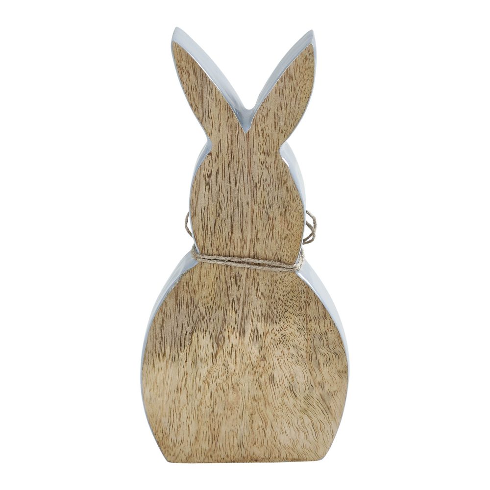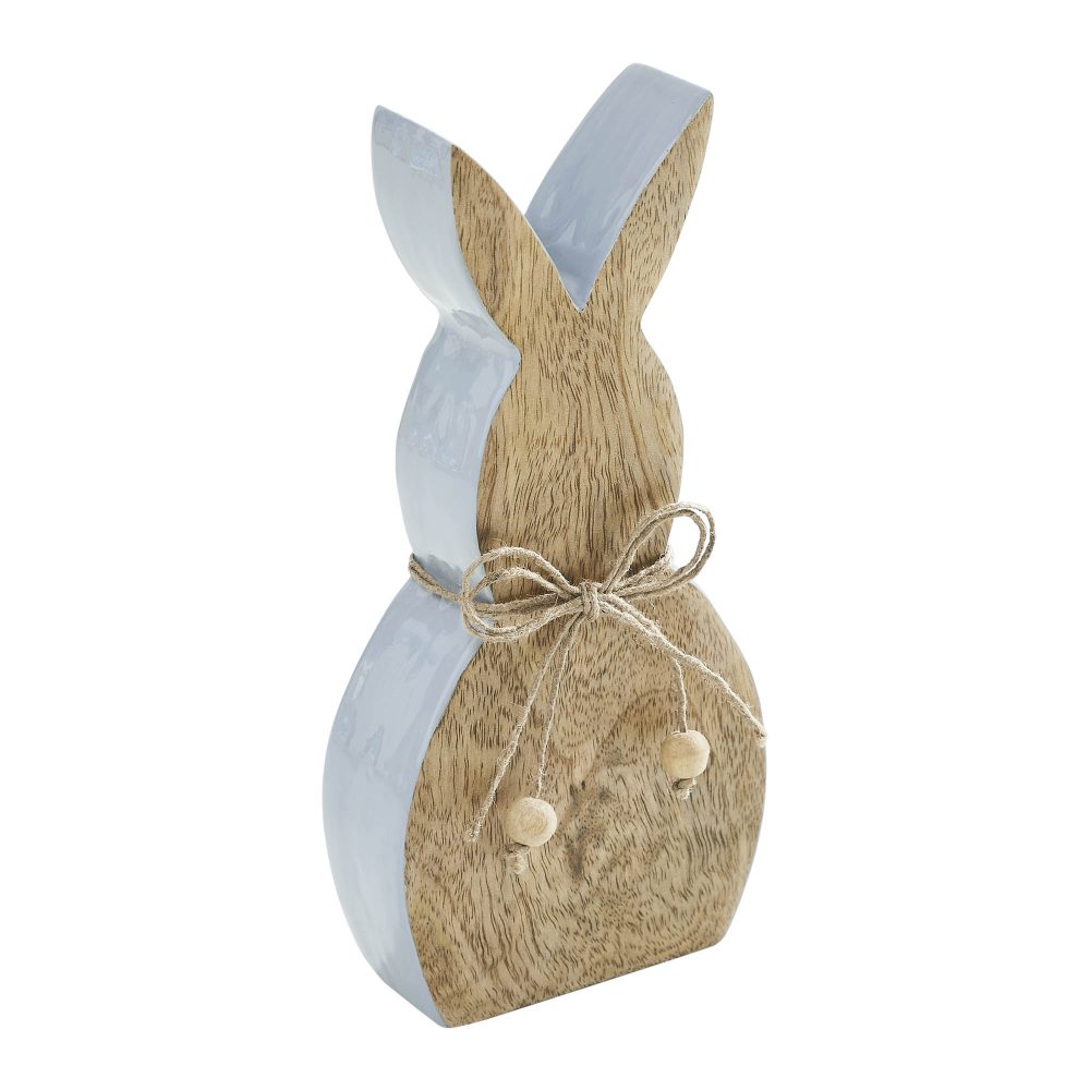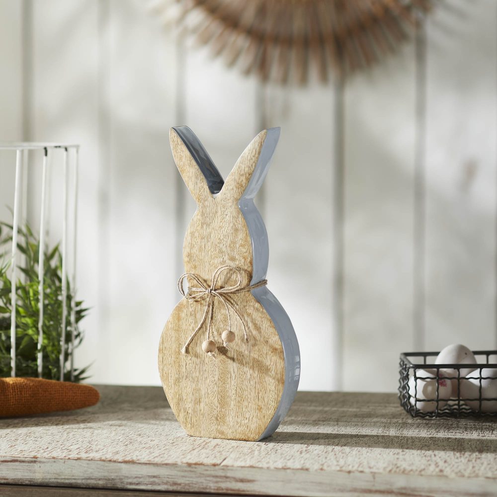 Enhance your spring decor with the VHC Brands Spring In Bloom Wooden Enamel Edge Bunny. Crafted from solid tropical wood, this charming figurine features a classic bunny silhouette with elegant slate grey enamel trim along the sides. The rustic design is finished with a twine bow adorned with natural wooden beads, offering a sophisticated touch to any setting. Measuring 8.5 inches in height and 4 inches in width, this bunny figurine strikes a perfect balance between presence and subtlety. Its natural wood brown and slate grey color scheme harmonizes beautifully with various decor styles, making it a versatile piece for both traditional and contemporary settings. The primitive and vintage spring bunny design adds a timeless appeal to your home. Easy to maintain, this piece only requires a gentle wipe with a soft cloth to keep it looking its best. Ideal for placement in any room-whether the bathroom, bedroom, dining room, entryway, kitchen, or living room-this painted bunny will bring a touch of springtime charm and cheer to your home decor. Celebrate the season with this elegantly crafted and painted bunny, perfect for adding a warm, rustic touch to your space.
