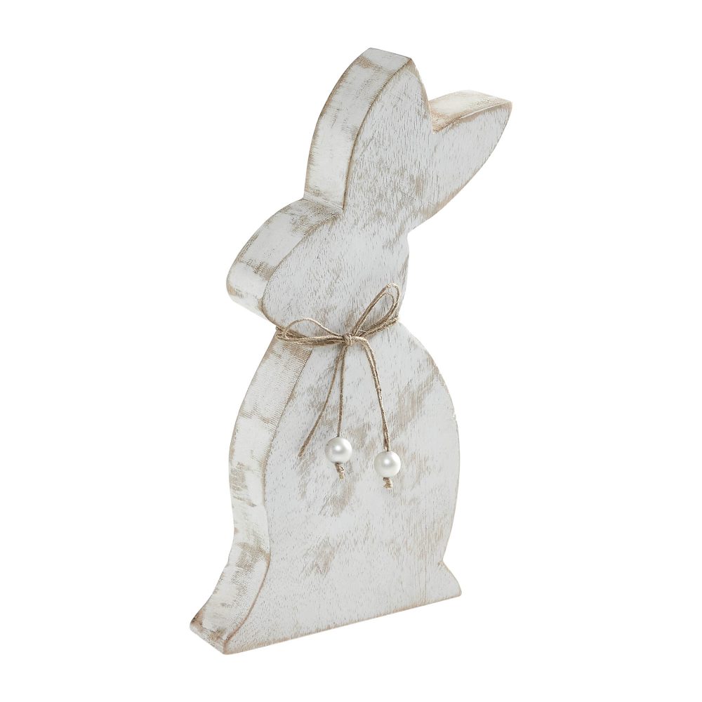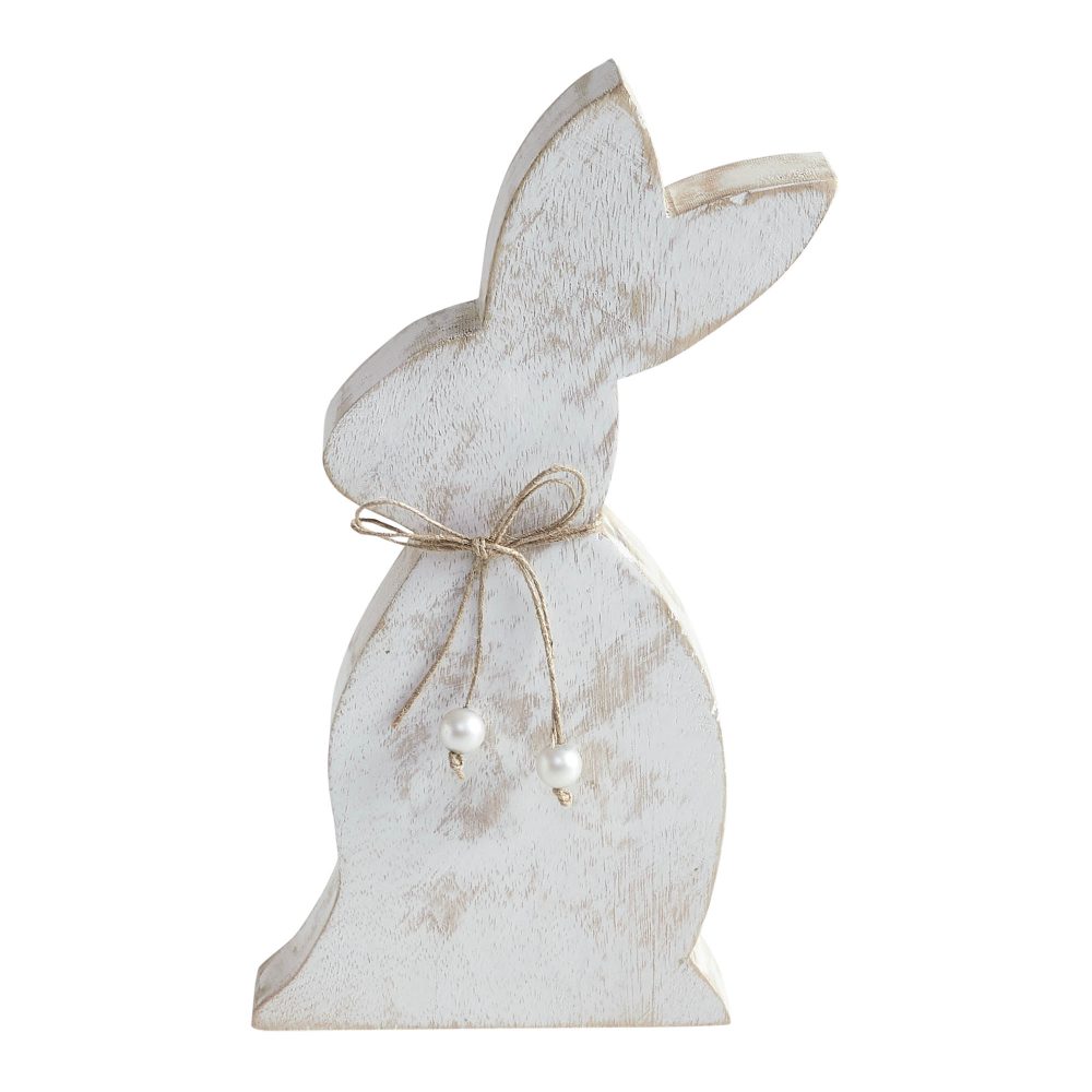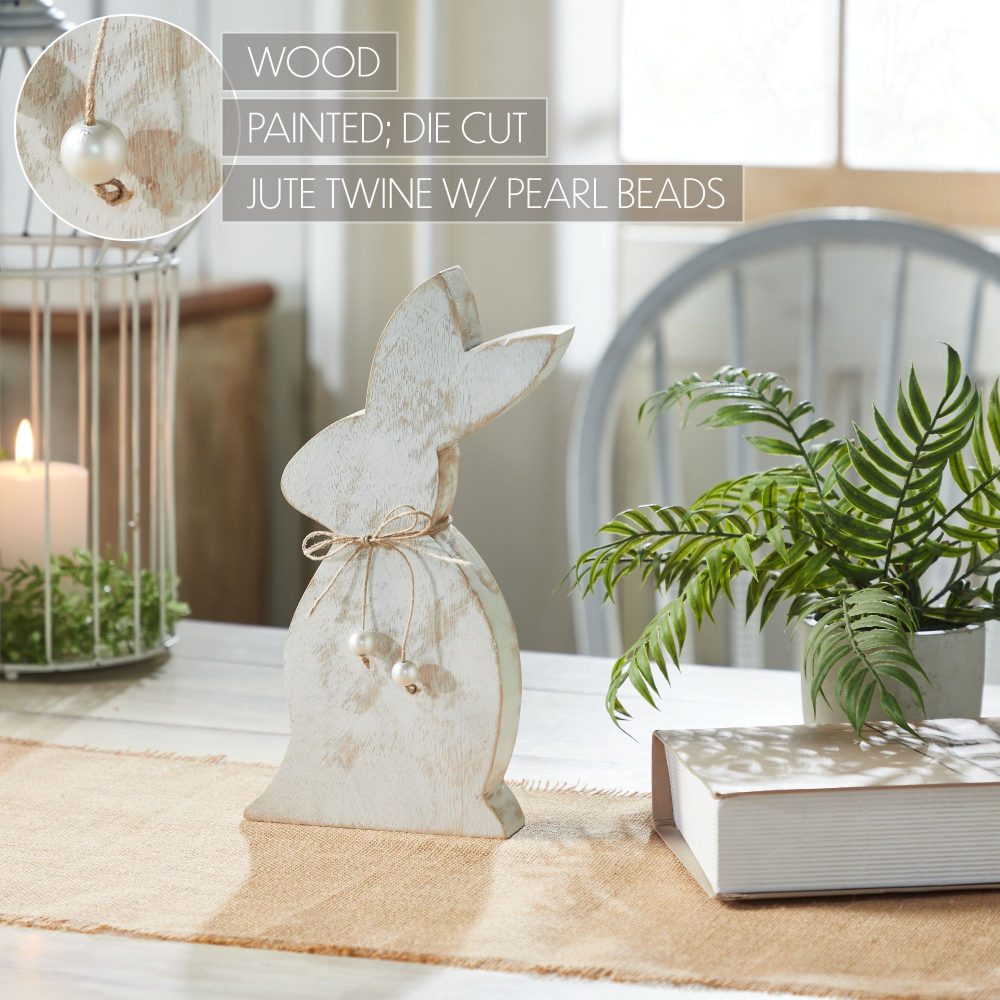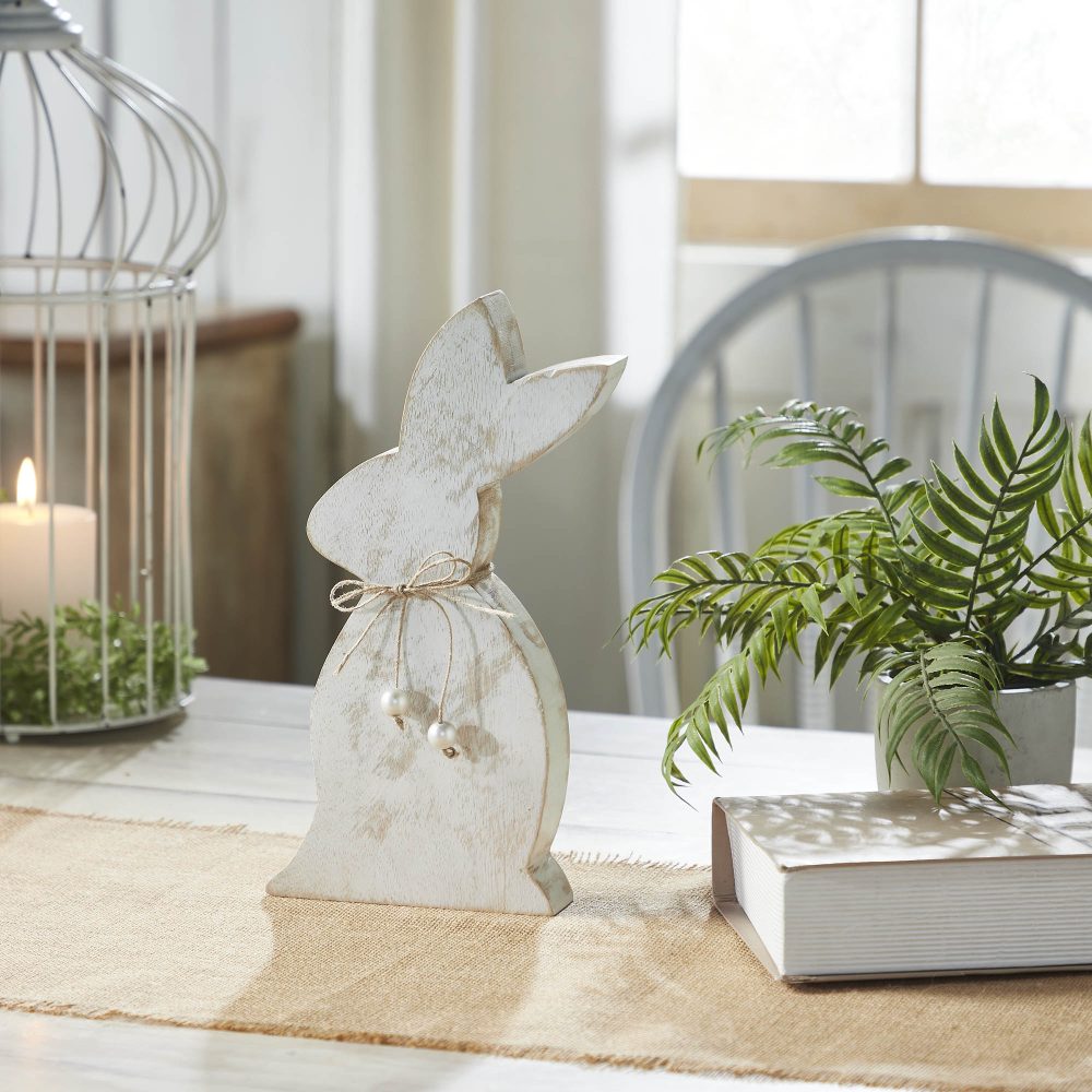 Enhance your springtime decor with the VHC Brands Spring In Bloom Wooden Upright Bunny Silhouette. This charming figurine features a standing bunny silhouette crafted from tropical wood and finished in a distressed white. The rustic, primitive design is complemented by subtle wood brown accents, making it a versatile addition to any room in your home. Measuring 11.5 inches tall and 6 inches wide, this bunny silhouette is the perfect size to make a delightful statement on your tabletop or shelf. It is adorned with a jute bow and pearl beads, adding a touch of elegance and vintage charm to its classic design. Whether displayed in your bathroom, bedroom, dining room, entryway, kitchen, or living room, this bunny silhouette captures the essence of spring with its timeless appeal. For easy maintenance, simply wipe the figurine clean with a soft cloth to keep it looking fresh and pristine. Its solid color and painted details offer a sophisticated yet playful touch to your spring and Easter decorations. Elevate your seasonal decor with this beautiful wooden bunny, which effortlessly blends rustic charm with a refined, vintage-inspired look.