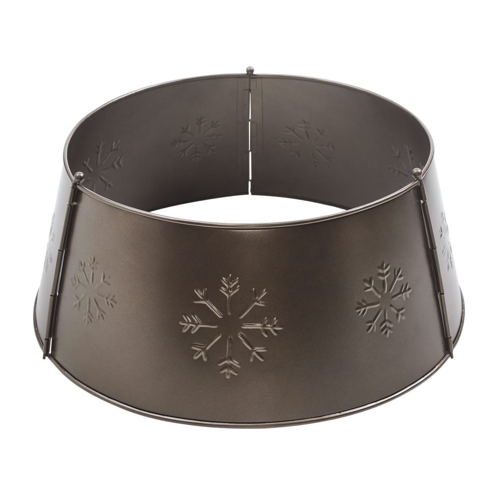 • Stamped Snowflake Design: Adorned with an intricate stamped snowflake pattern, this tree collar brings a festive, wintery touch to your holiday display.