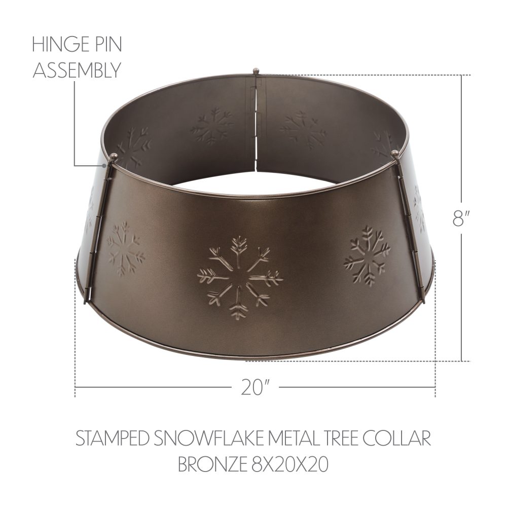 Elevate your holiday tree display with the VHC Brands Stamped Snowflake Metal Christmas Tree Collar in a rich bronze finish. Measuring 8x20 inches, this beautifully crafted tree collar features a classic round design adorned with intricate stamped snowflake patterns, adding a festive and rustic touch to your Christmas decor. Its warm bronze hue brings a cozy, vintage-inspired glow that enhances any seasonal setting. Constructed from durable metal, this tree collar includes a convenient hinge pin assembly for easy installation and a secure fit around your tree base. The solid color and textured snowflake design provide a polished foundation that complements a variety of holiday themes, from primitive rustic to traditional farmhouse. This accessory offers a sophisticated alternative to traditional tree skirts, combining functionality with timeless style. Perfect for use throughout your home-in the bathroom, bedroom, dining room, entryway, kitchen, or living room-this Stamped Snowflake Metal Christmas Tree Collar adds elegance and festive spirit to any space. Maintenance is simple with a quick wipe using a soft cloth to preserve its warm bronze sheen year after year. This classic piece is a must-have for creating a cohesive and charming Christmas display.