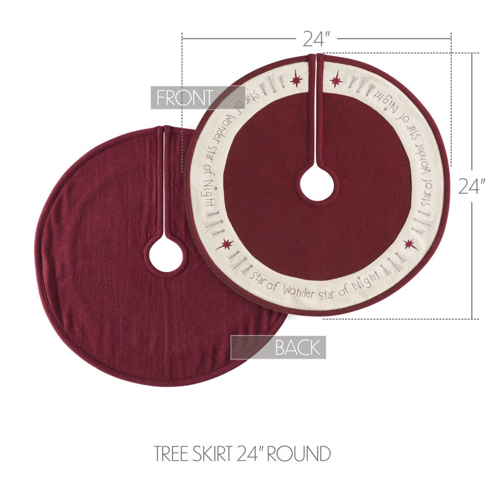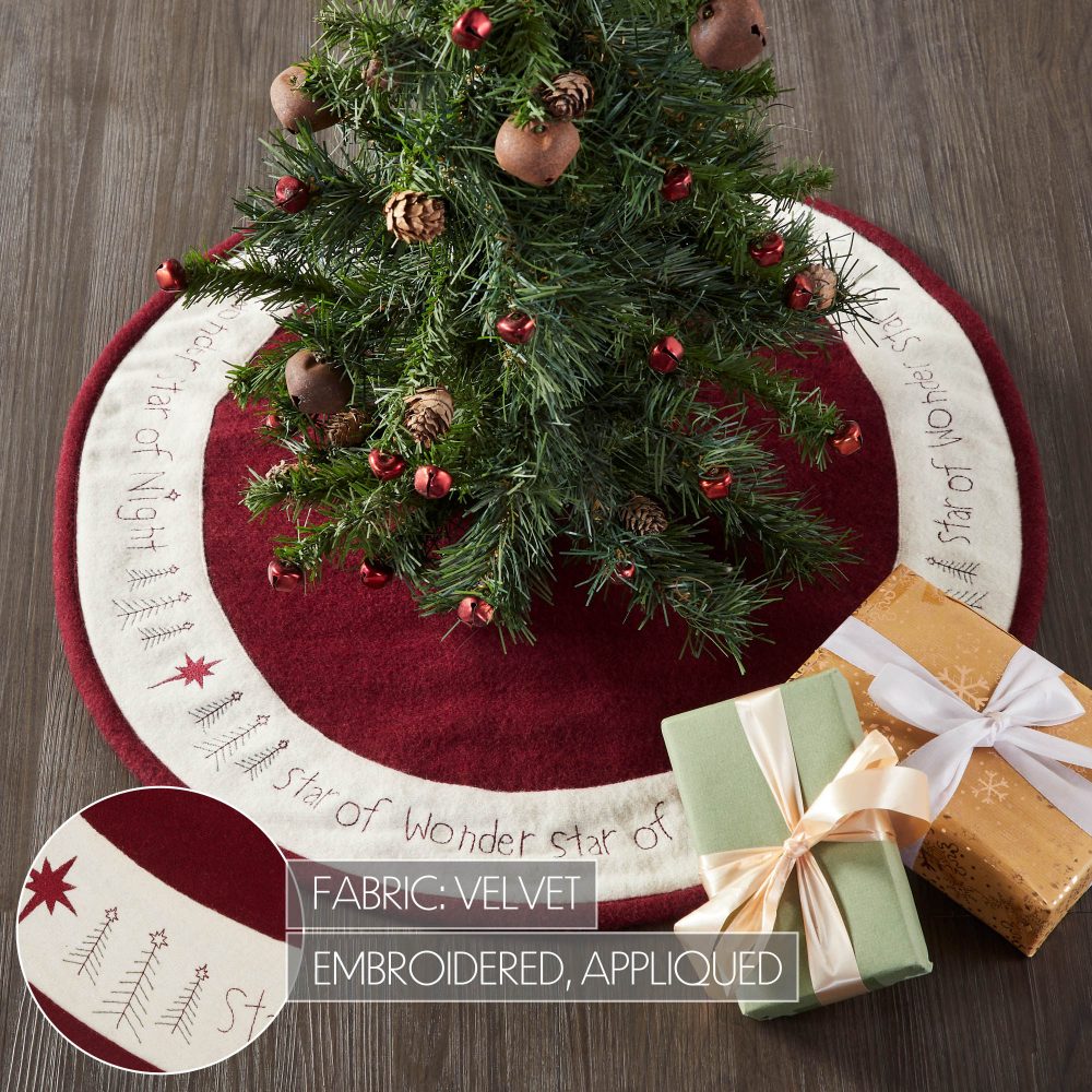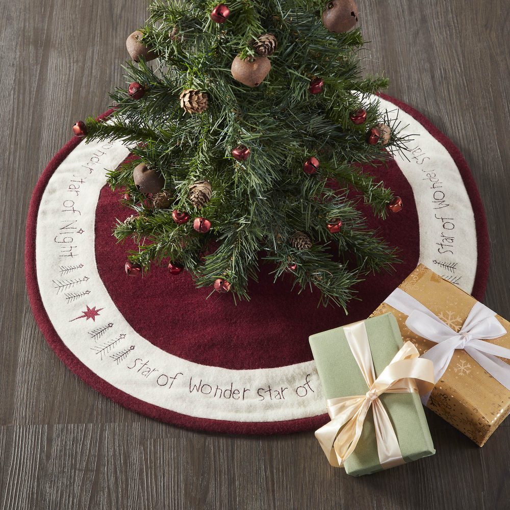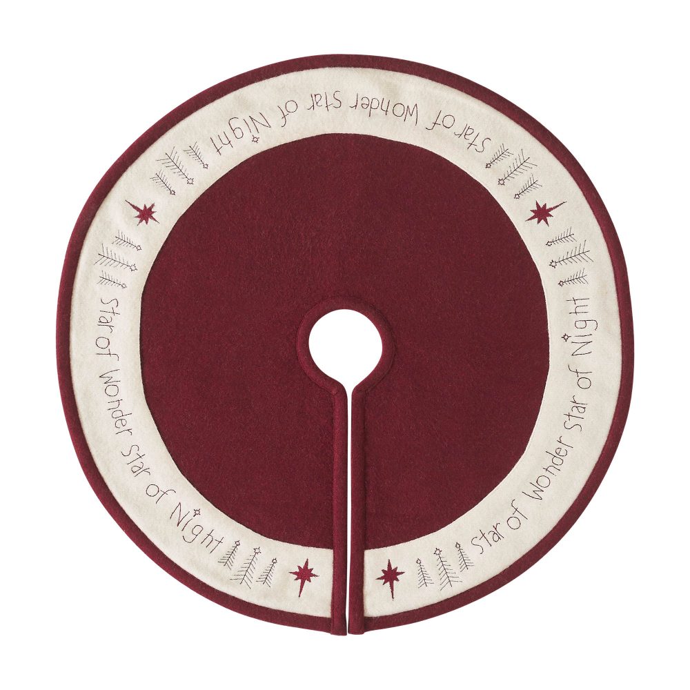 Create warm Christmas memories around a traditional Christmas tree with this primitive style Christmas tree skirt. The round tree skirt features a 24 inch diameter. A warm burgundy base in felt will add simple, sophisticated style for a perfect country Christmas look. A wide, embroidered border adds a primitive touch to the design. The elegant Christmas tree skirt features embroidery within the cream border reading, Star of Wonder, Star of Night with star accents. Pair with matching stockings for a complete, festive holiday look.