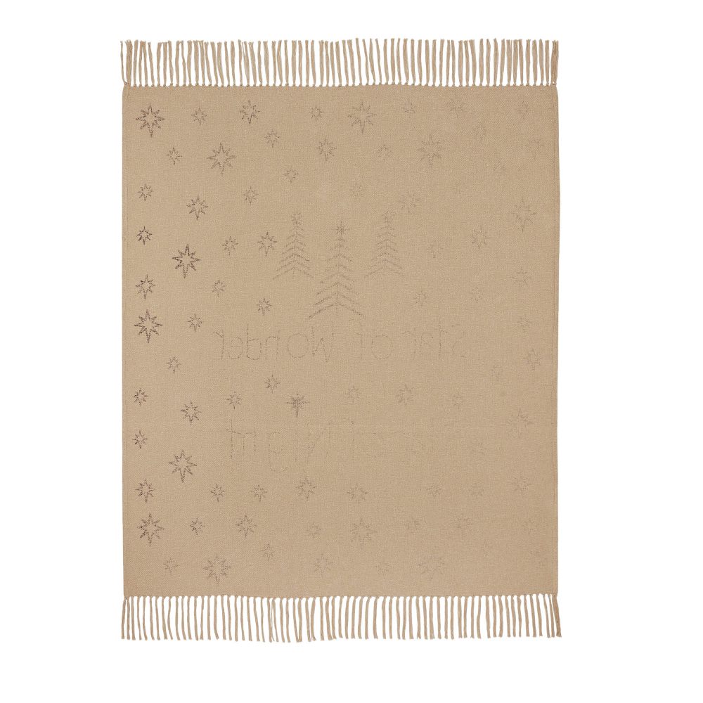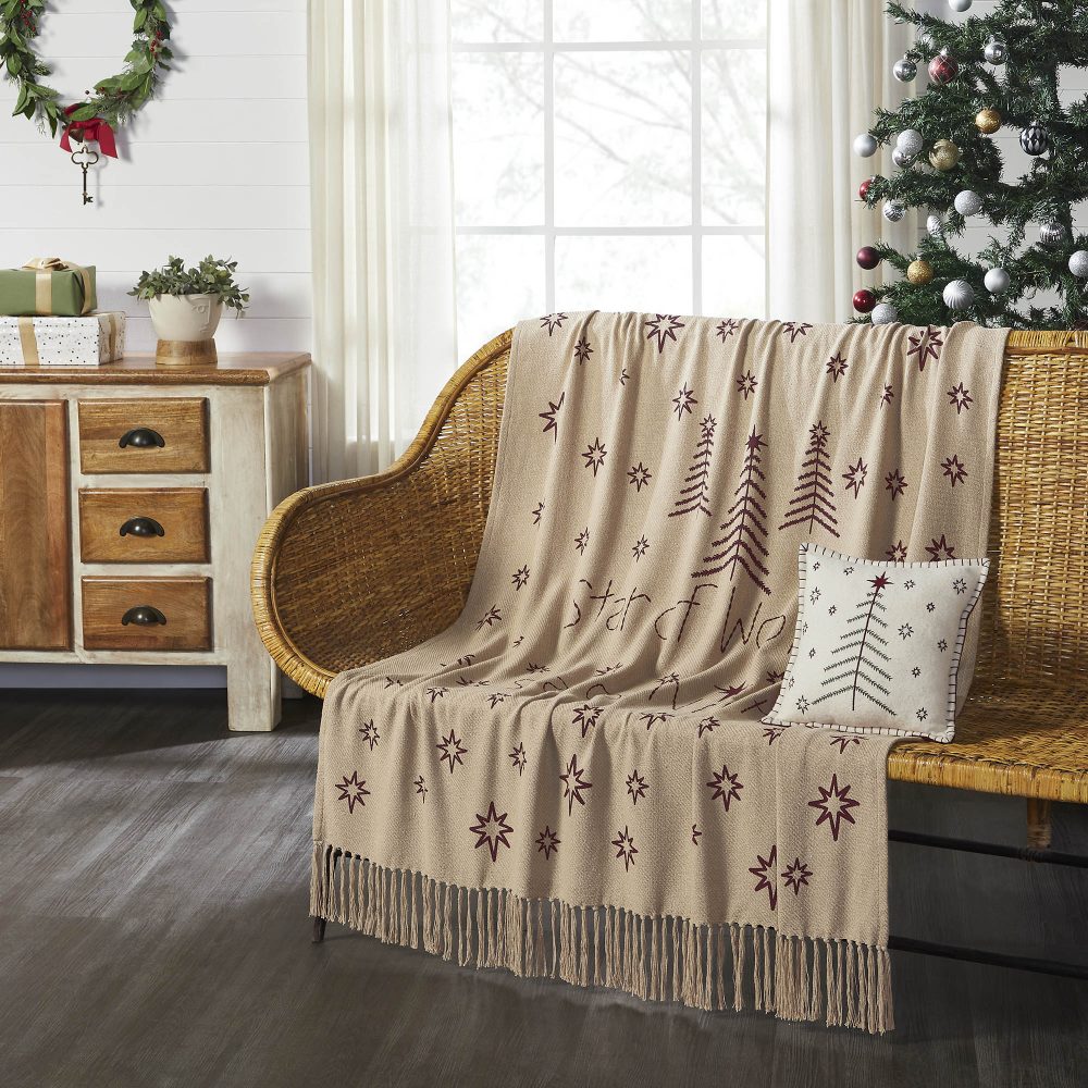 Transform your home into a cozy winter lodge with primitive country style. The Star of Wonder Woven Throw measures 50x60 inches. The classic rustic country throw blanket features a biscuit tan base with burgundy accents. A pattern of primitive style stars surround a central design of three Christmas trees above the words, Star of Wonder, Star of Night. Tasseled edging adds an extra pop of texture. Coordinates with the Star of Wonder Collection by VHC for primitive country style for your whole home.