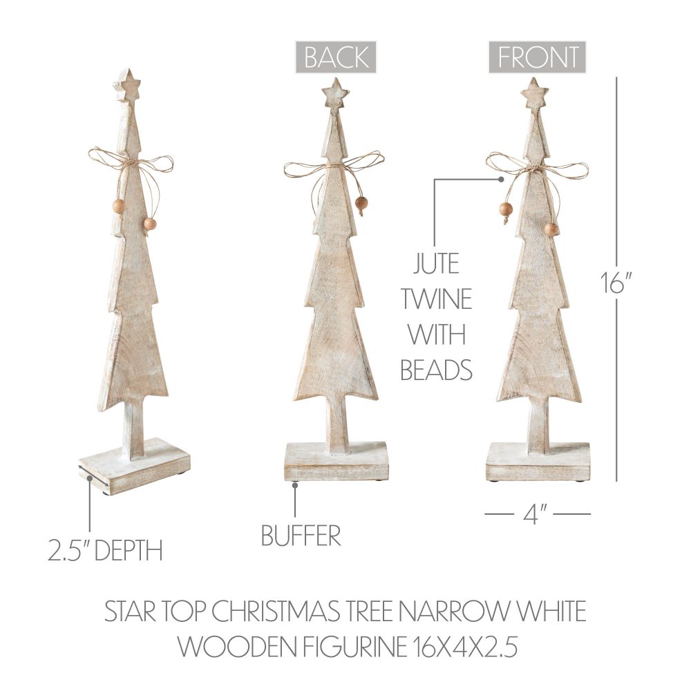 Add a touch of vintage charm to your winter and Christmas decor with the VHC Brands Tropical Wood Star Top Christmas Tree. Crafted from high-quality tropical wood, this slender figurine features a classic Christmas tree silhouette adorned with a star topper, standing at 16 inches tall, 4 inches wide, and 2.5 inches deep. Its narrow profile makes it perfect for tabletops, shelves, or mantels in any room of your home.The antique white finish lends a timeless elegance to this wooden Christmas tree, evoking a sense of nostalgia and rustic allure. Its primitive design and distressed appearance enhance its vintage appeal, creating a cozy and welcoming atmosphere reminiscent of old-fashioned holiday celebrations. Whether displayed in your bathroom, bedroom, dining room, entryway, kitchen, or living room, this charming figurine adds a festive touch to your indoor decorations. Maintaining the pristine appearance of this wooden Christmas tree is easy - simply wipe it clean with a soft cloth to remove dust and maintain its vintage charm throughout the holiday season. Whether used as a standalone accent piece or incorporated into a larger holiday display, this star-topped tree brings a sense of warmth and tradition to your home decor, spreading Christmas cheer to all who behold it.