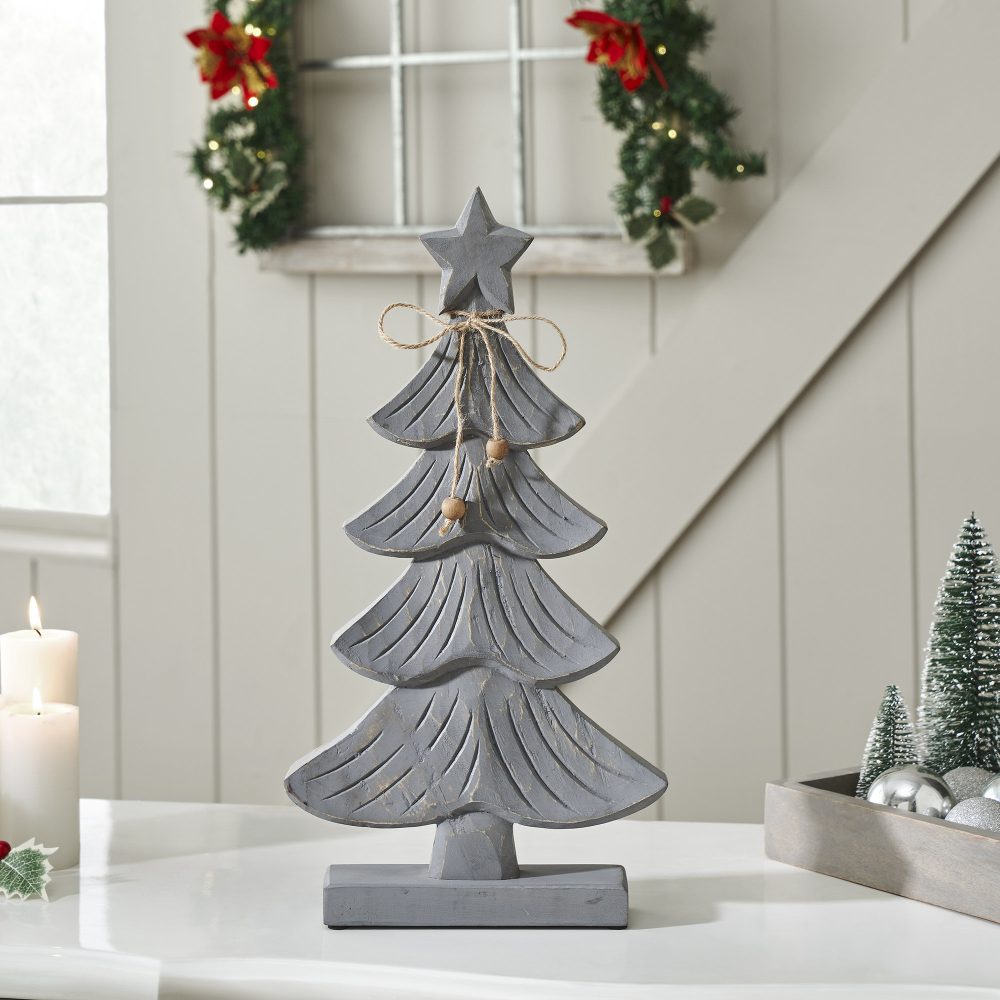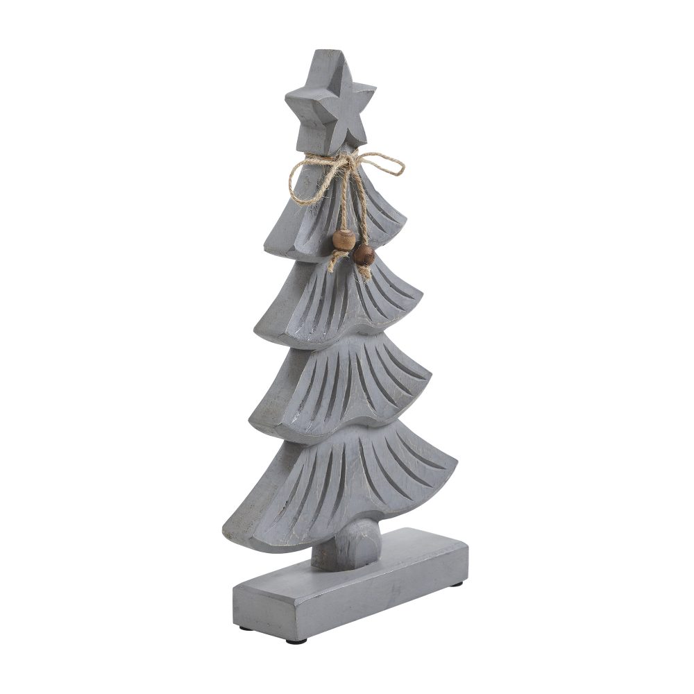 - Winter Grey Wooden Design: Features a beautifully carved Christmas tree with boughs and a star on top, painted in winter grey for a rustic, primitive holiday look.