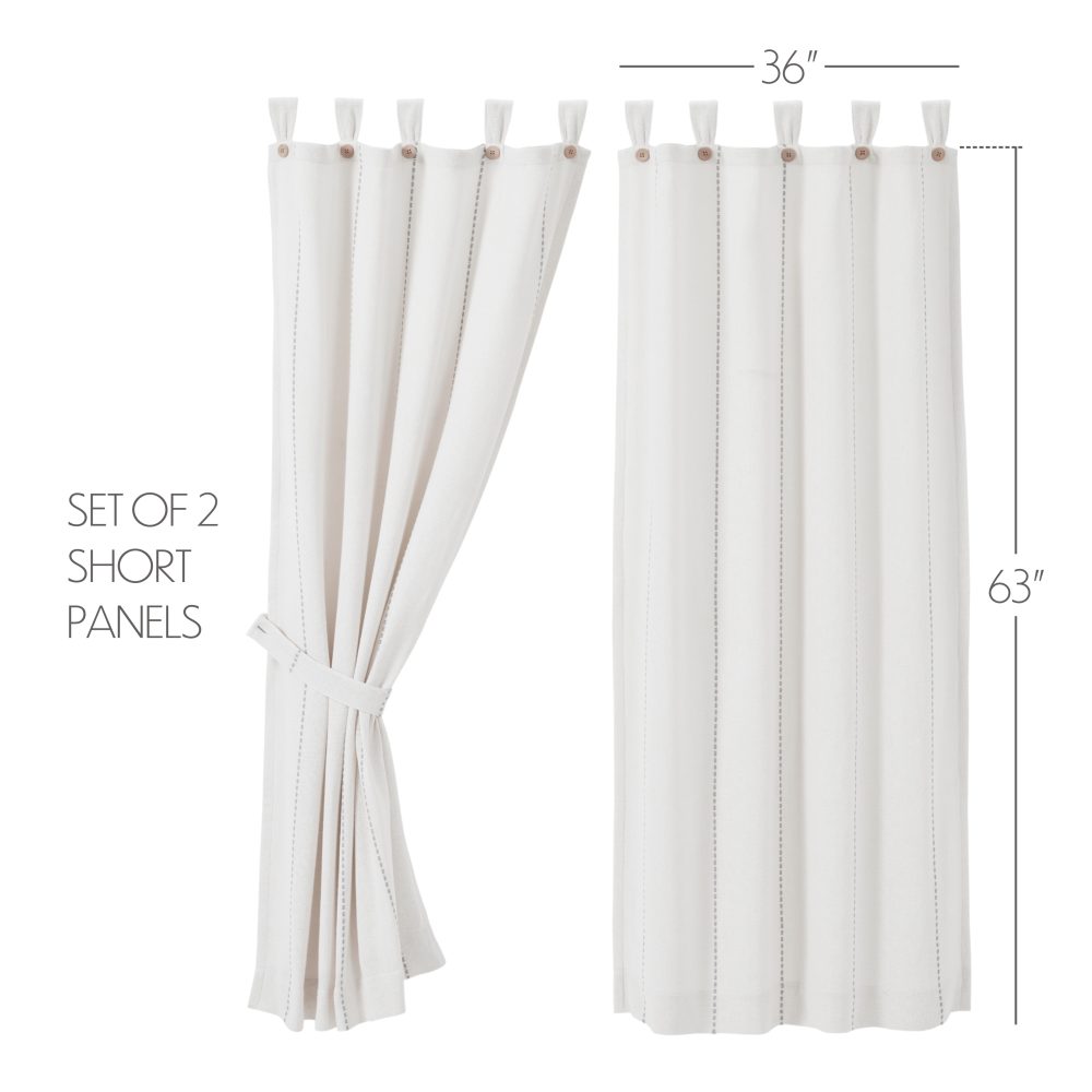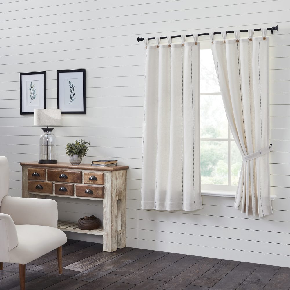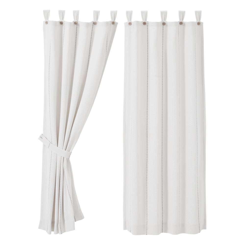 Transform your home with simple, country-style details. The Stitched Burlap White Short Panel Set of 2 63x36 features a white burlap base and charming stitched detailing in dove grey producing a lovely striped pattern. Tabs included for easy hanging with button details for style. Lined for additional privacy. Includes matching tie backs.