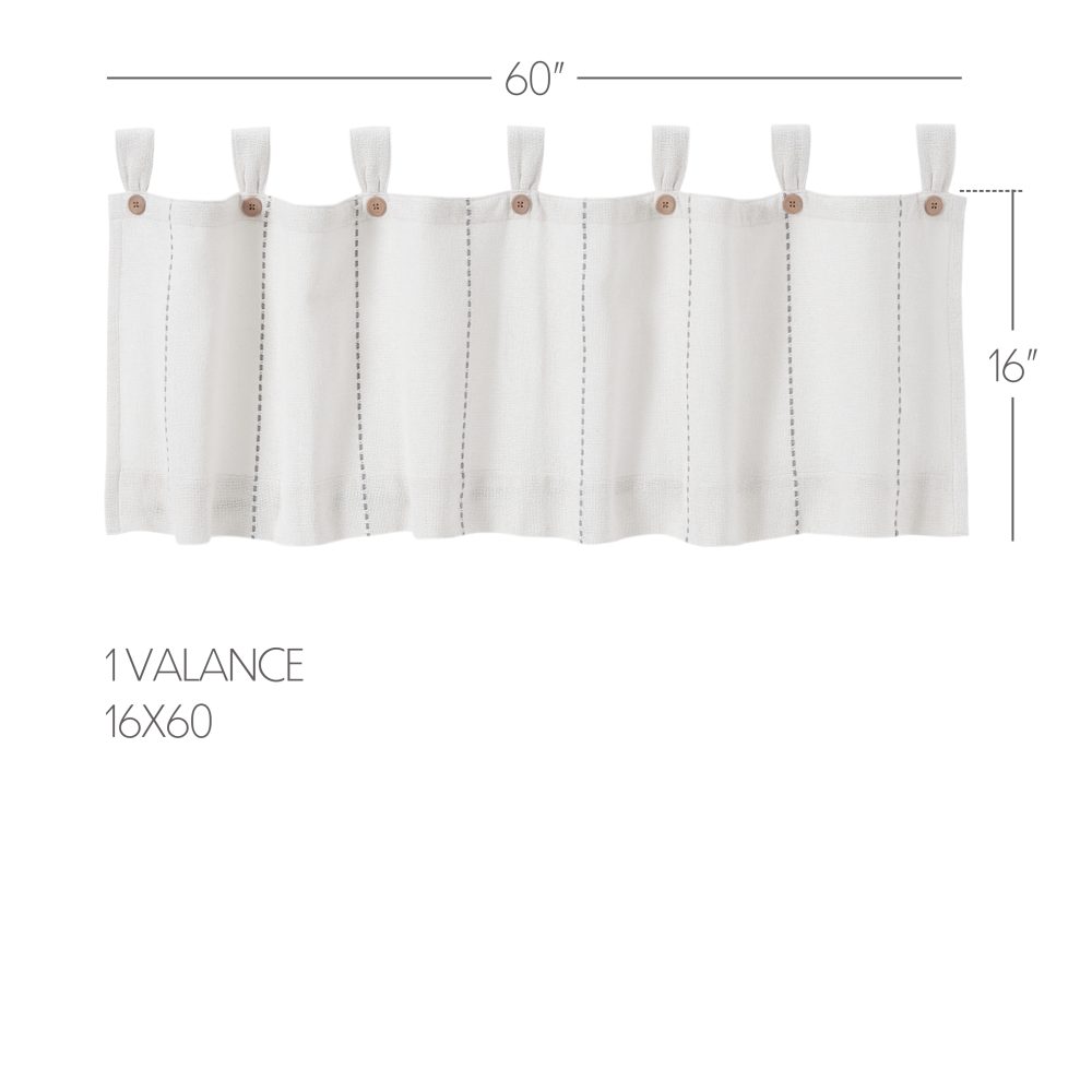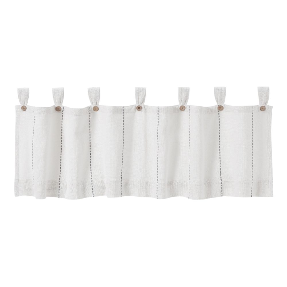 Transform your home with simple, country-style details. The Stitched Burlap White Valance 16x60 features clean white burlap coloring and charming stitched detailing in dove gray. Tabs included for easy hanging with button details for style. Lined for additional privacy.