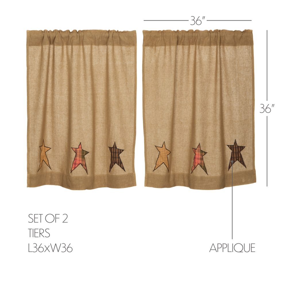 Invite primitive visual appeal to any room with the eye-catching Stratton Burlap Applique Star Tier Set. Enjoy a row of whimsical stars in red, orange, and yellow plaids on a soft tan burlap background. Made completely from 100% cotton, our unlined 36x36 tier set contributes a warm, unique design to your kitchen, dining room, or bathroom windows as the cozy palette inspires primitive, log cabin, and farmhouse-themed looks. Machine washable and iron-safe, this textured valance curtain has a rod pocket for easy hanging.