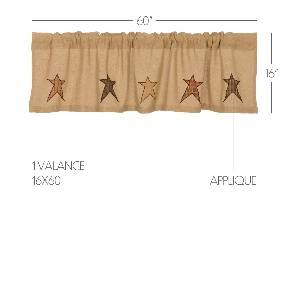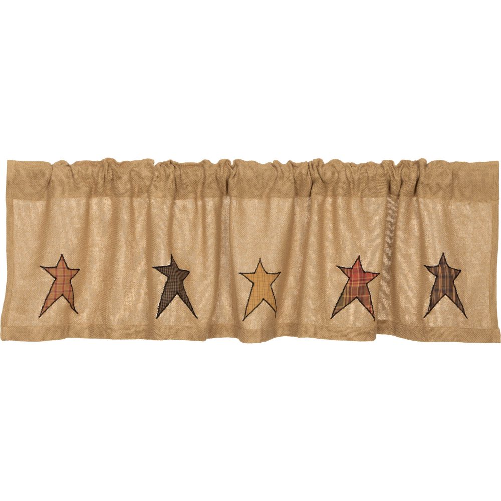Invite primitive visual appeal to any room with the eye-catching Stratton Burlap Applique Star Valance. Enjoy five whimsical stars in red, orange, and yellow plaids on a soft tan burlap background. Made completely from 100% cotton, our unlined 16x60 valance contributes a warm, unique design to your kitchen, dining room, or bathroom windows as the cozy palette inspires primitive, log cabin, and farmhouse-themed looks. Machine washable and iron-safe, this textured valance curtain has a rod pocket for easy hanging.