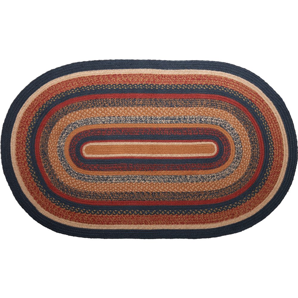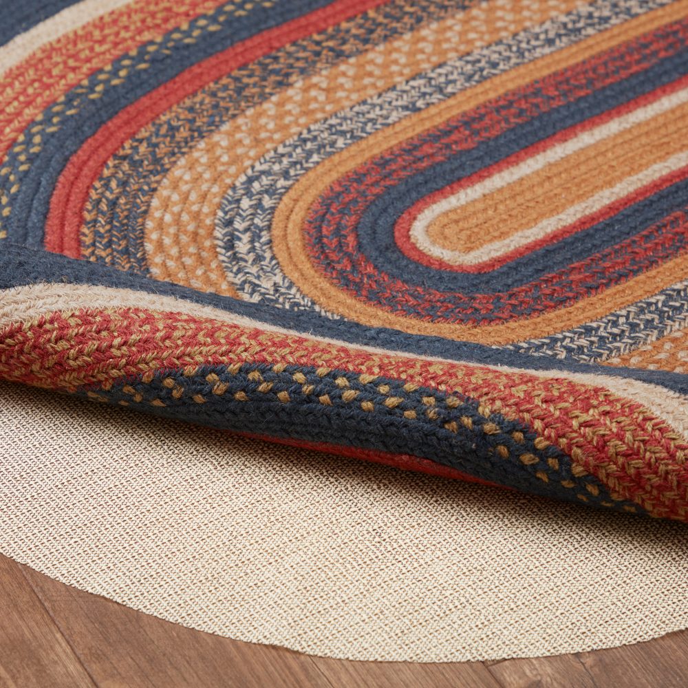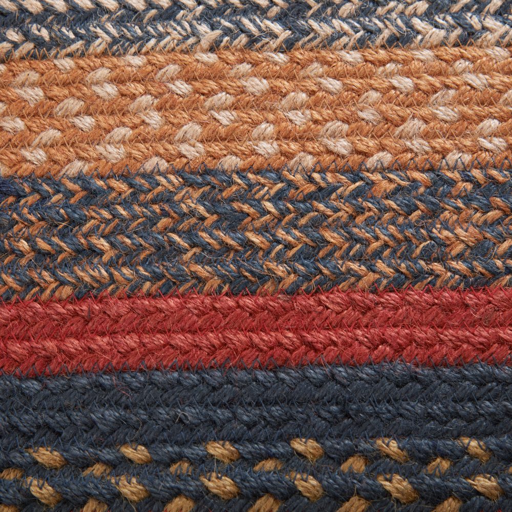 Create a bright, homey feeling with colorful, textured braids in a curl-resistant jute blend that adds style and safety anywhere a large accent rug is needed. The Stratton Jute Rug measures 36x60 inches and features a classic oval shape and tight braids constructed with a durable jute blend. The special blend relaxes faster and stays flat. The included PVC mat makes sure your beautifully braided jute rug stays exactly where it should. Features a blend of navy blue, ruby red, and copper orange for a lively, rustic look that complements a wide array of primitive country and farmhouse decor.