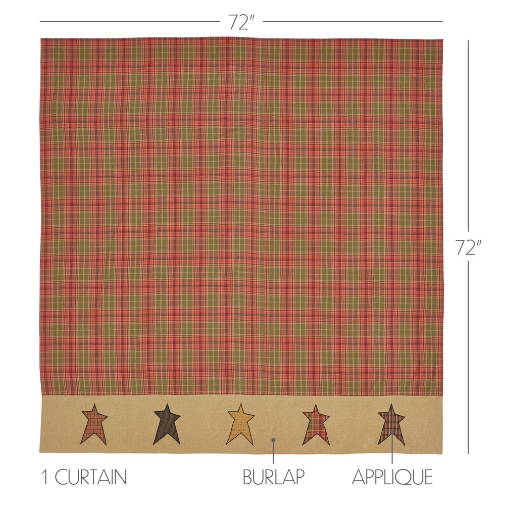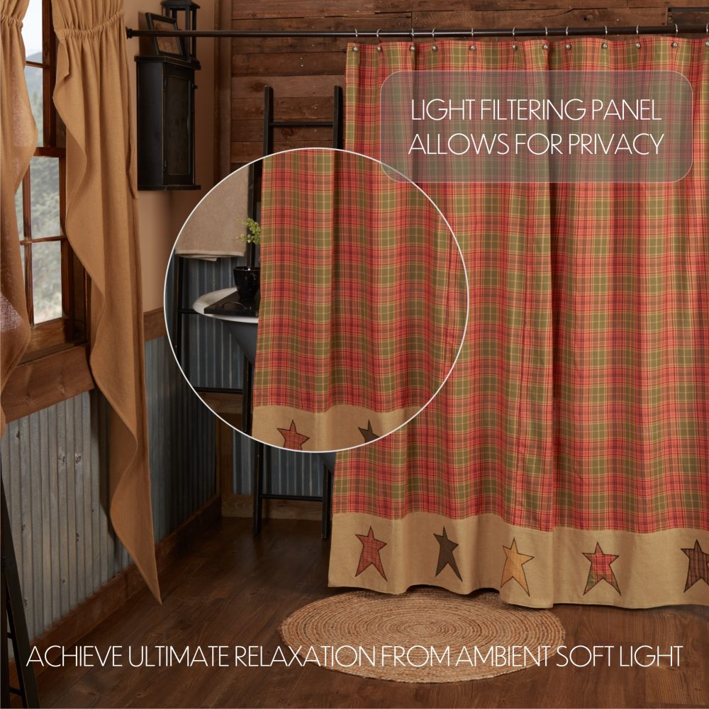 Decorate your bathroom with the perfect blend of whimsical colors and primitive country charm with the Stratton Shower Curtain. Featuring a tartan plaid in red-orange, olive green and natural tan with a row of folksy star applique accents on a bold khaki bottom border, our 72x72 fabric shower curtain provides a modern primitive touch to your decor. This machine washable, 100% cotton shower curtain includes button holes for shower hooks and a rod pocket for versatility and convenience.
